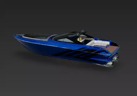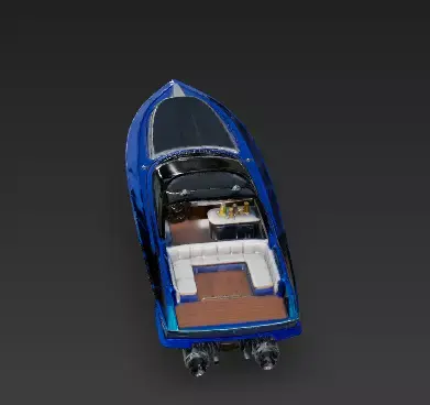 Electric Blue Metallic Paint The hull is coated in a vibrant, electric blue paint with a metallic finish. It’s aggressive and sporty, designed to turn heads. To emphasize the speed, we added sharp, angular black racing stripes (decals) along the side.