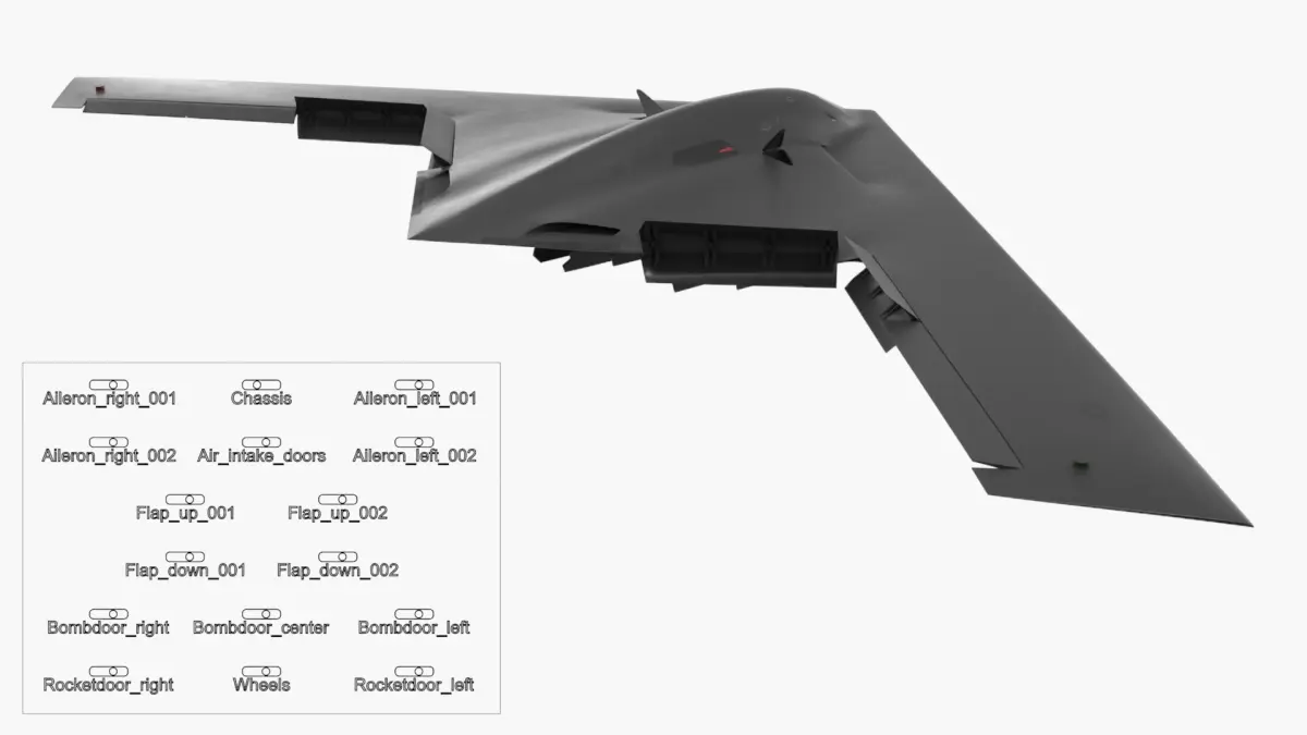 B 21 Raider Low Observable Aircraft Black Attac Animated Rigged is fully rigged and is ready to be animated. You can easily position it the way you need or animate it the way your project requires using helpers in 3D Studio Max. See the turntable to get an idea of how rigging works.
