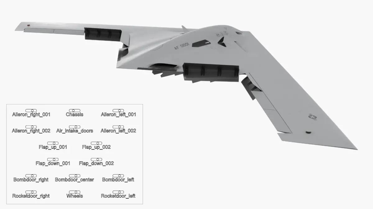 B-21 Raider Sixth Generation Bomber Used White Rigged is fully rigged and is ready to be animated. You can easily position it the way you need or animate it the way your project requires using helpers in 3D Studio Max. See the turntable to get an idea of how rigging works.
