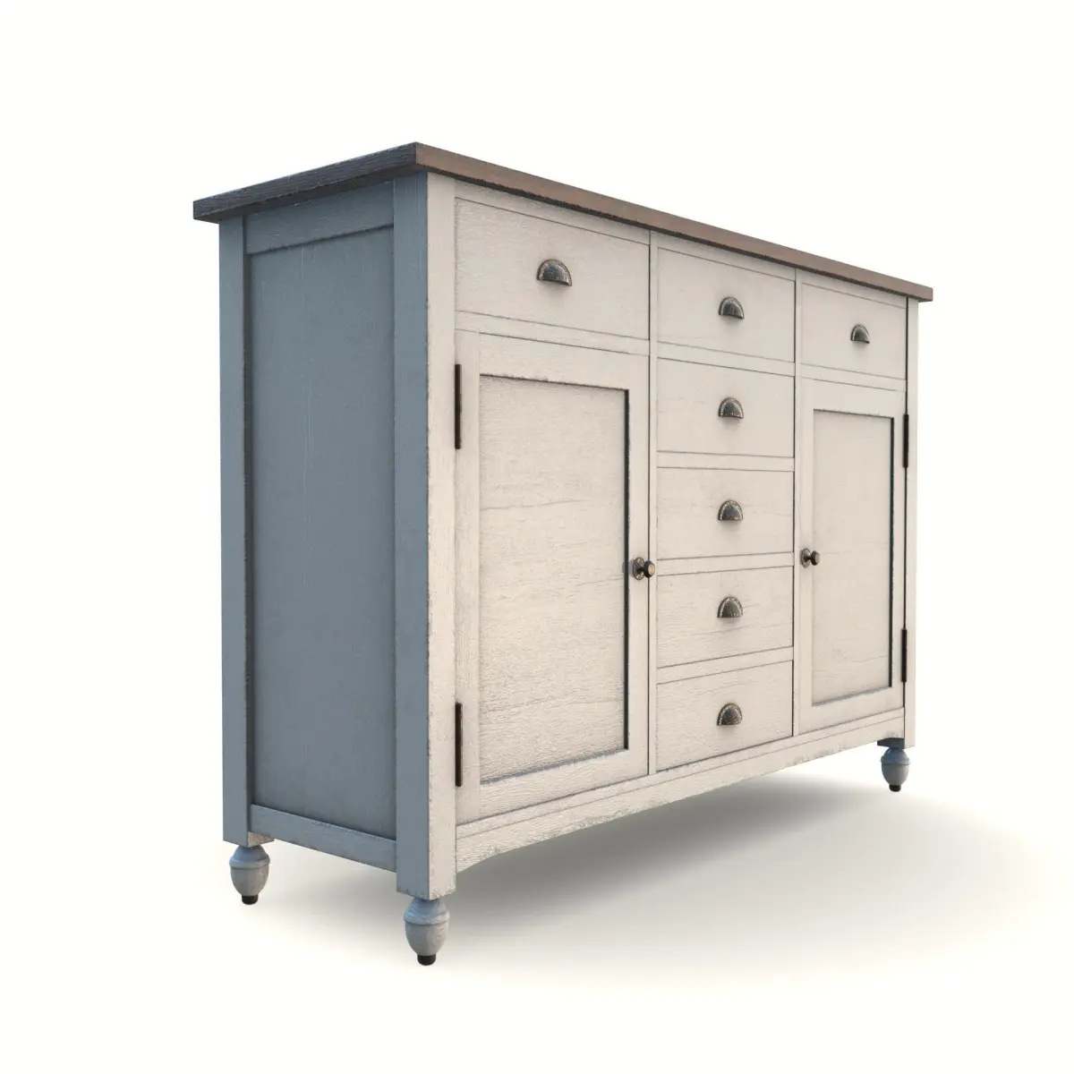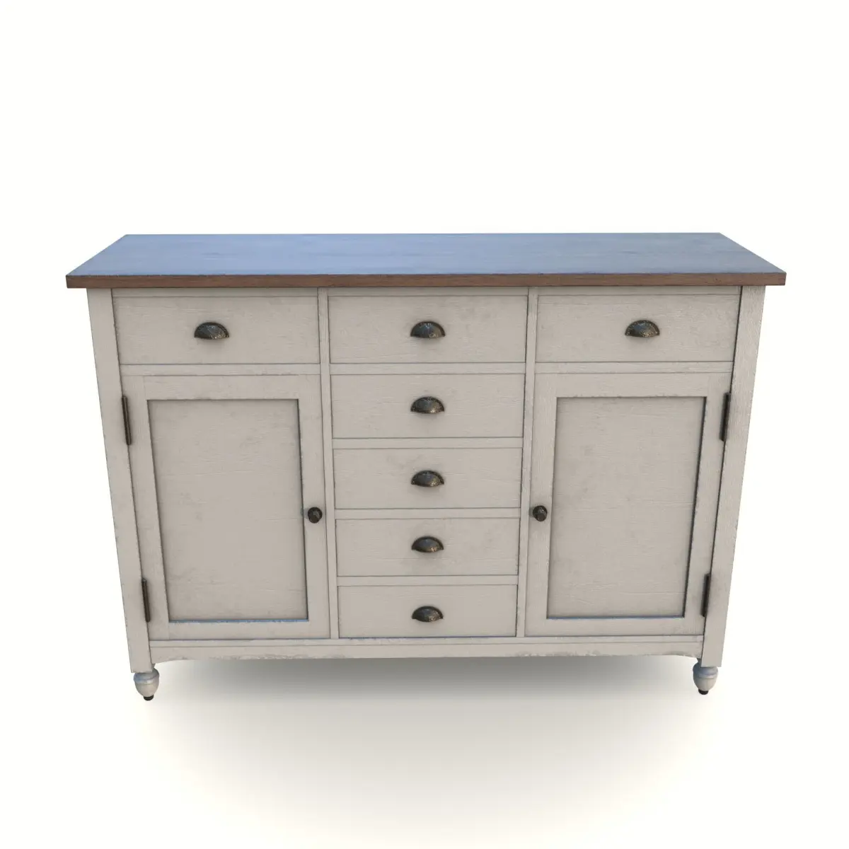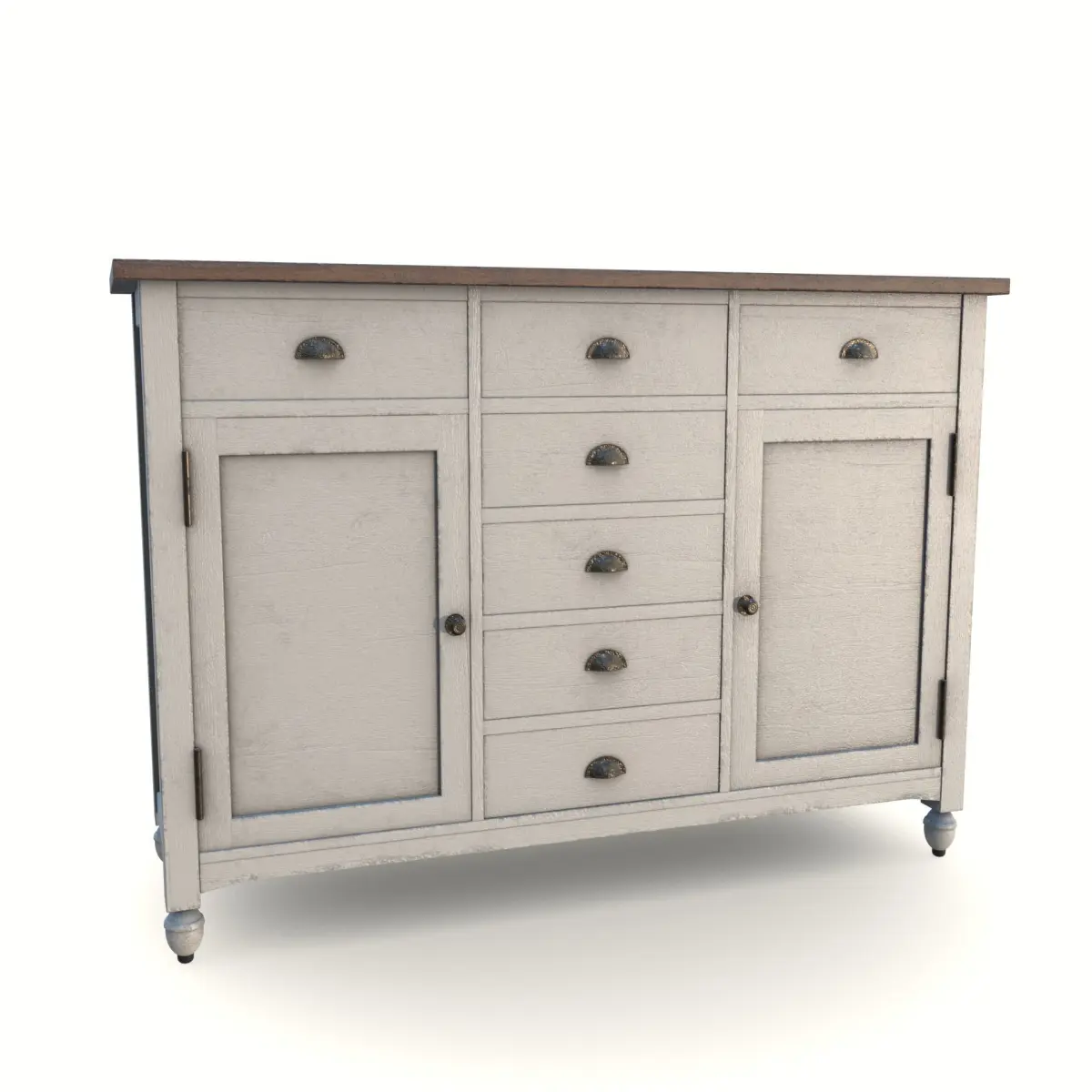 Embrace the charm of shabby chic with this buffet table featuring a distressed cream finish and delicate floral patterns. Made from reclaimed wood, it showcases curved legs and decorative metal drawer pulls. The table offers storage with drawers and cabinets, infusing your dining space with a romantic and vintage-inspired ambiance.