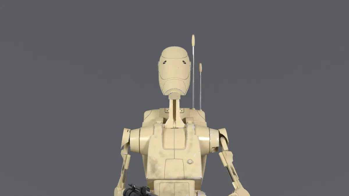 B1 battle droid model based on the droids from the film Star Wars Episode 1 and the Battlefront games. The E5-Rifle weapon model was made separately but included with the droid. The animation was made based on the activation of the droids as in the film. The model has textures created in Substance 3D Painter and exported with the Blender format and Unreal Engine. Texture Size - 4096.