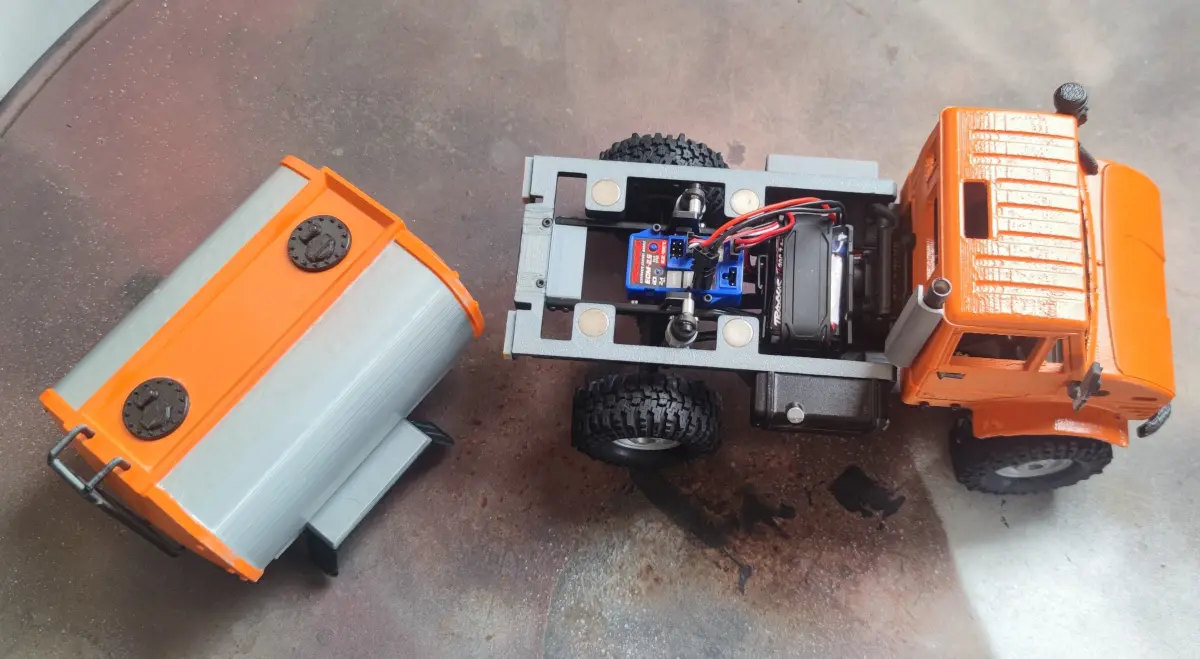 As the front cab is bolted in with screws, the fuel carrier is snapped on with 8 strong magnets. This provides easy battery changing operations as well as decreases the risk of breaking parts as the fuel carrier can detach when rollovers happen.