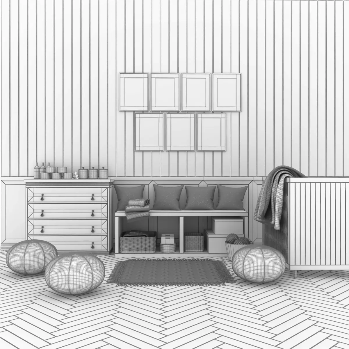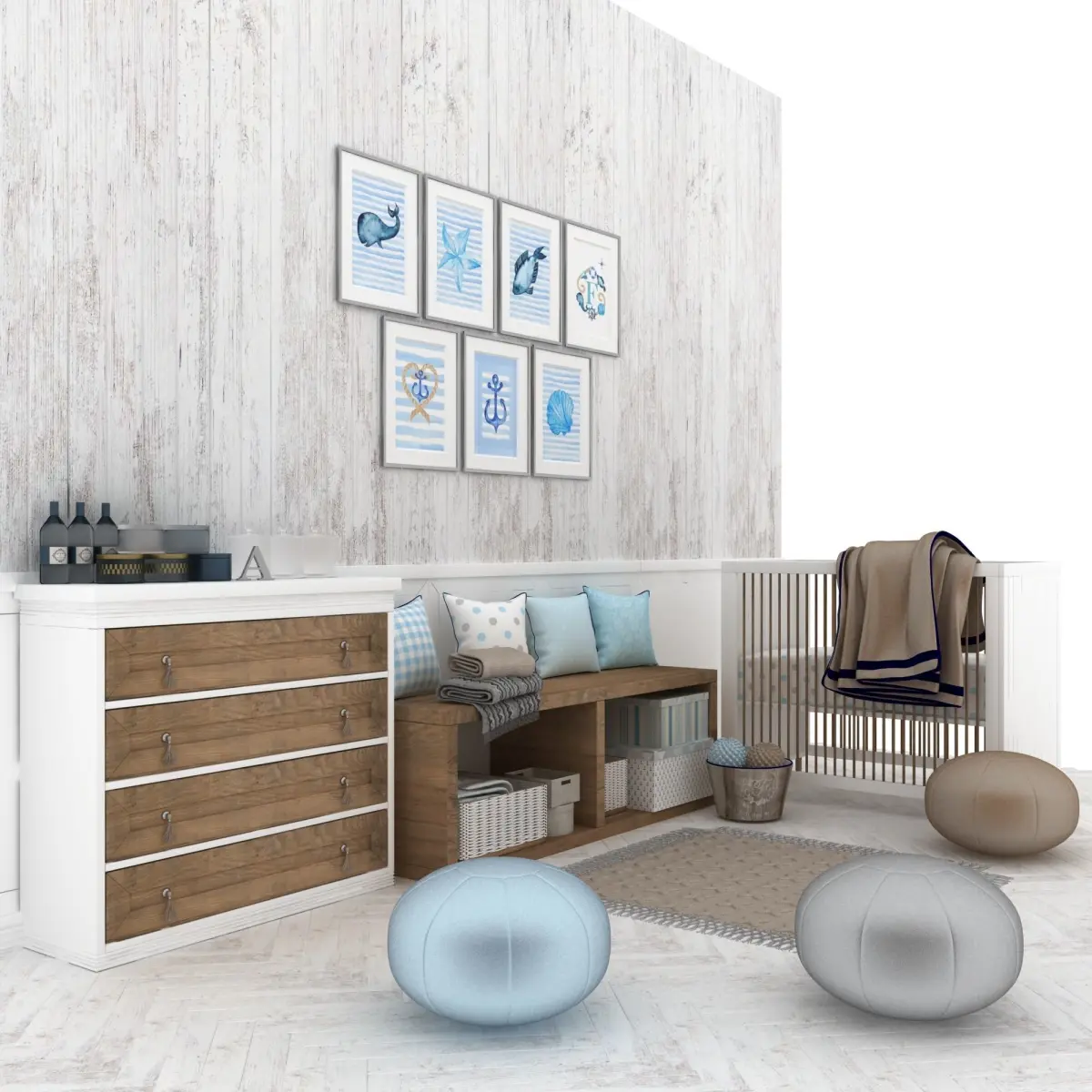 Baby boy room furniture with wooden floor and walls