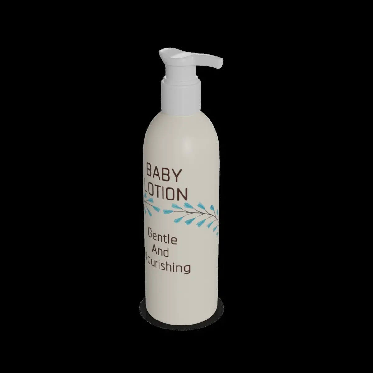 Baby Lotion: A bottle of moisturizing baby lotion, enriched with natural ingredients like shea butter and almond oil. The lotion has a creamy texture and a light, soothing fragrance. The packaging is a squeezable plastic bottle with a pink and white color scheme, featuring a label with the brand logo and a gentle and nourishing text.