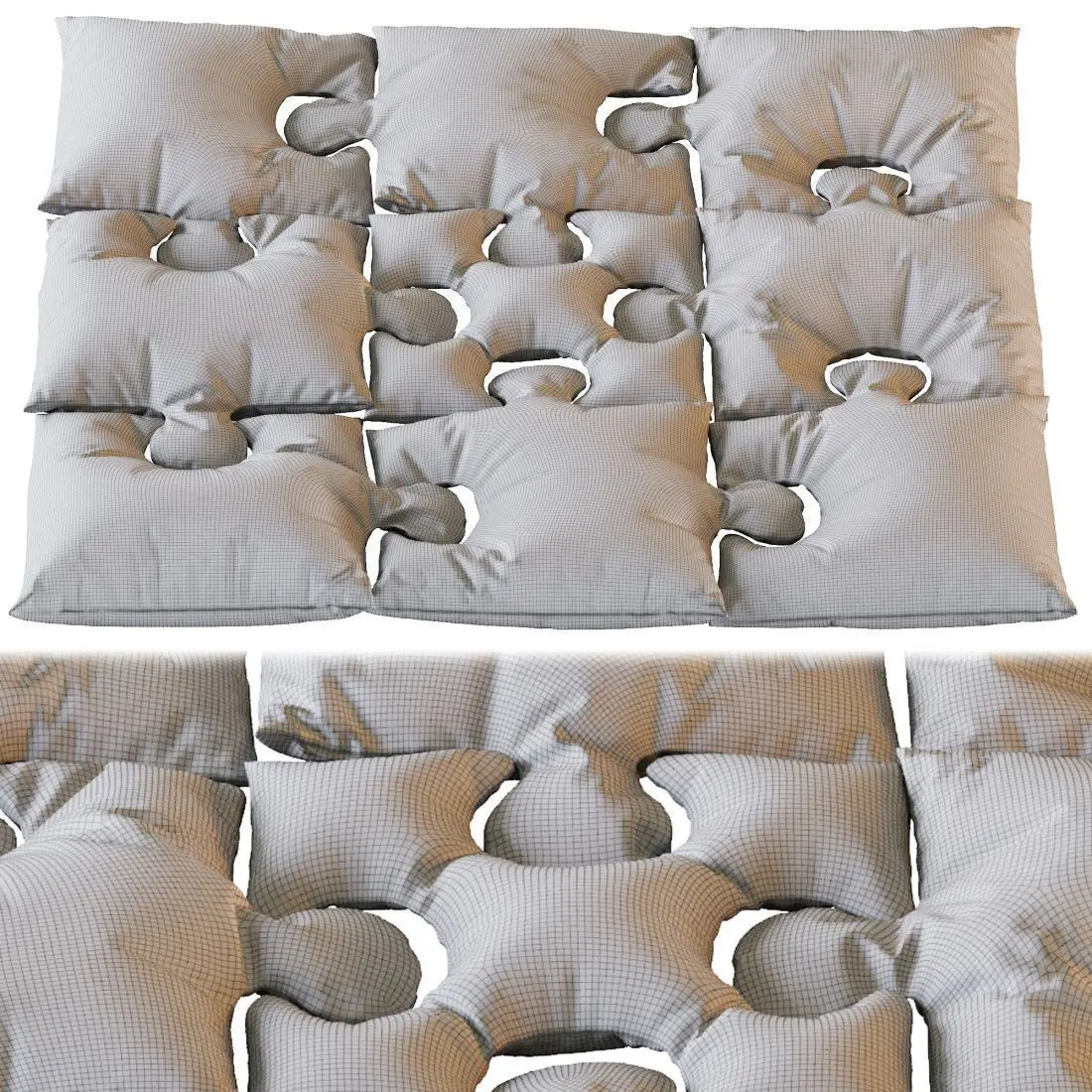 100% cotton with the warming material - hollow fiber.It consists of 9 pillows.It measures 32*32 inch