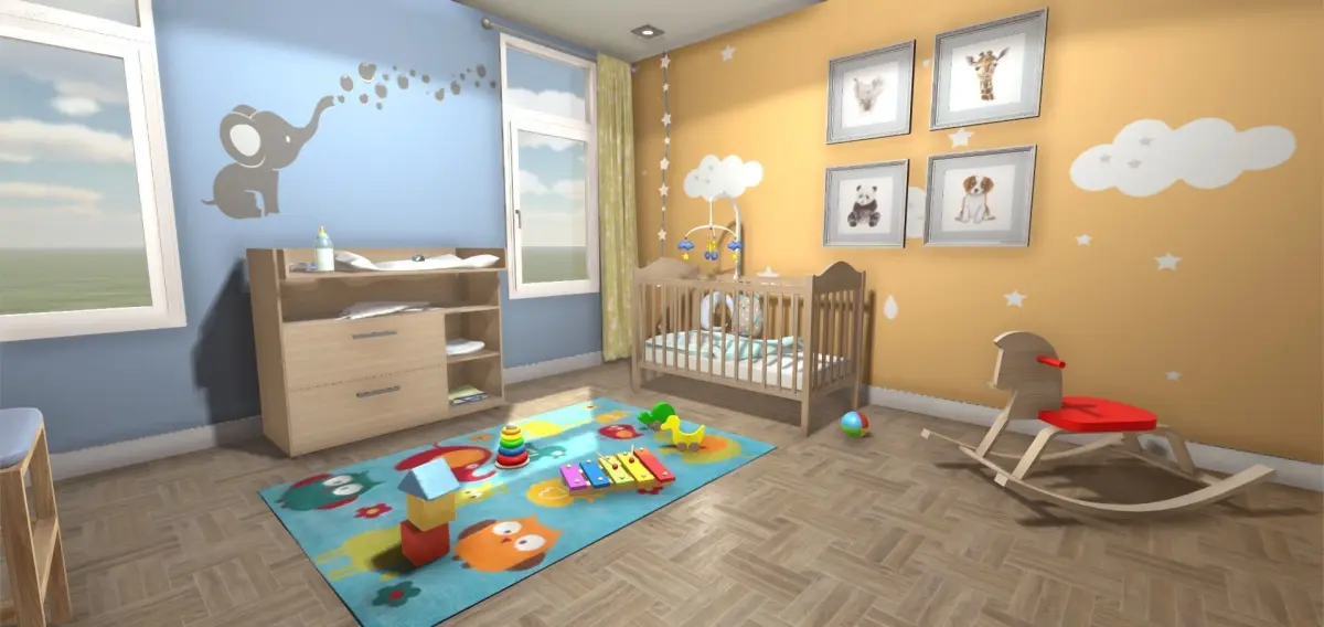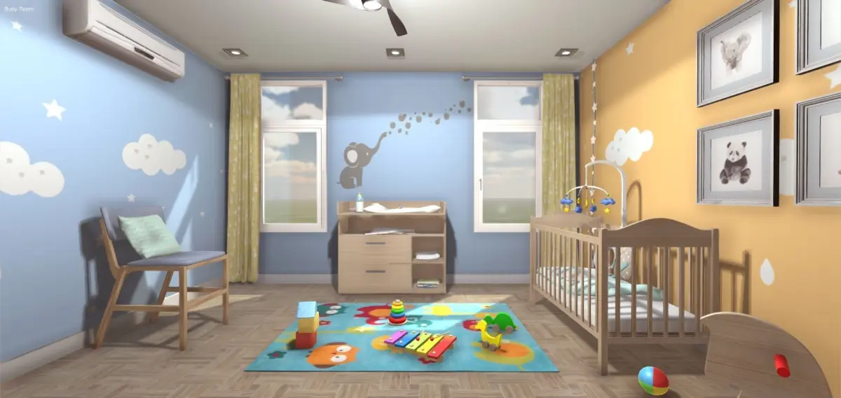Interior of a bedroom for a baby originally created for Unity. It has a total of 50 models. There are models of furniture like a crib, a wardrobe and a baby changing table . There are also objects like toys, pictures,two cushions,a pacifier, a baby bottle, wet towels, a mat, a mobile, a ventilator...etc. The walls have decoration for babies and toddlers. The door and the windows are scripted to be opened and closed when approaching with and indicative image and text to interact with the scene. There are also the FBX models included separately, textures included, to be used in other 3D apps. This low poly scene is ideal for games or applications.