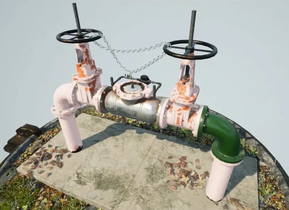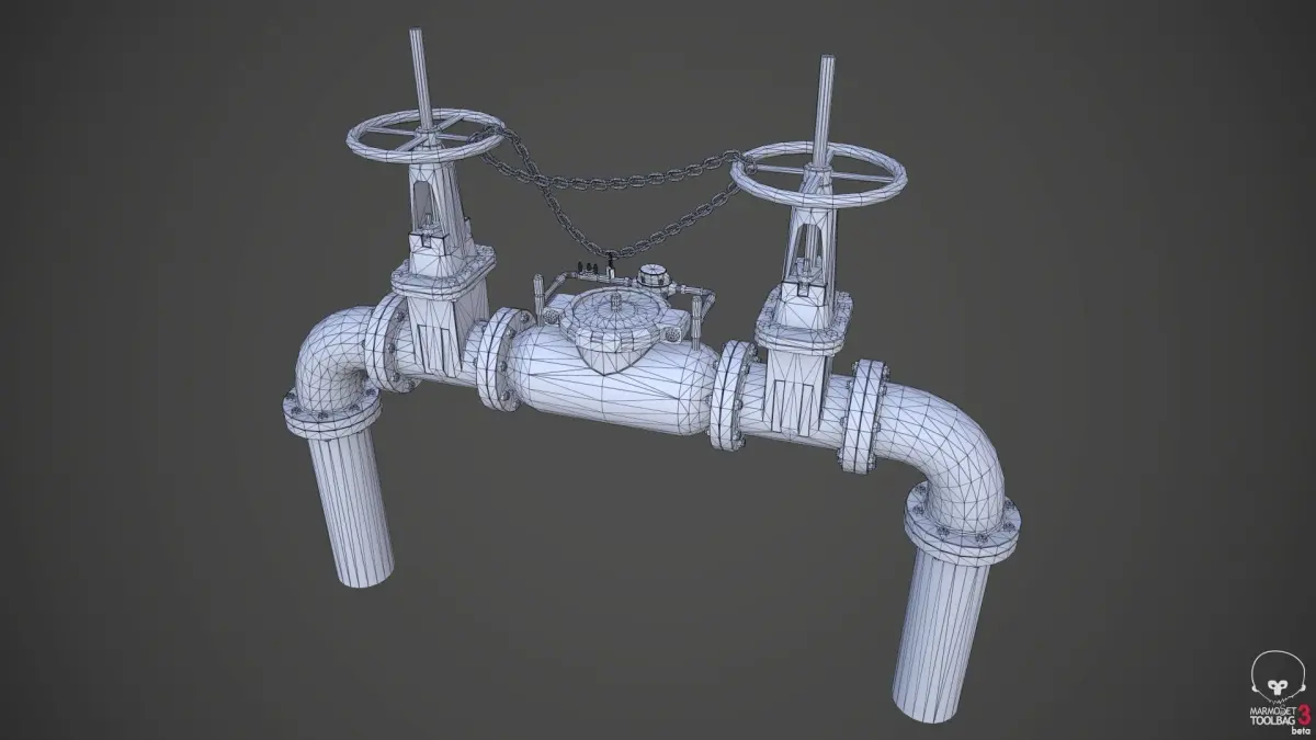 Backflow Prevention device 3D model. Created in Maya and textured in Quixel Suite. This utility pipe structure regulates and prevents the backflow of water and has always seemed to me to be rich in texture variety as well as modeling details. It is a great environment asset for architectural pre-visualization as well as industrial or city game environments.