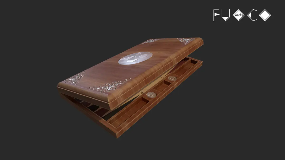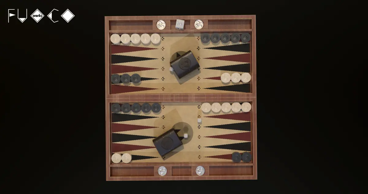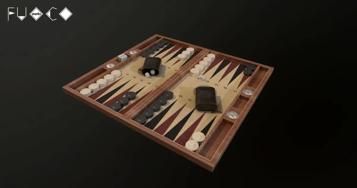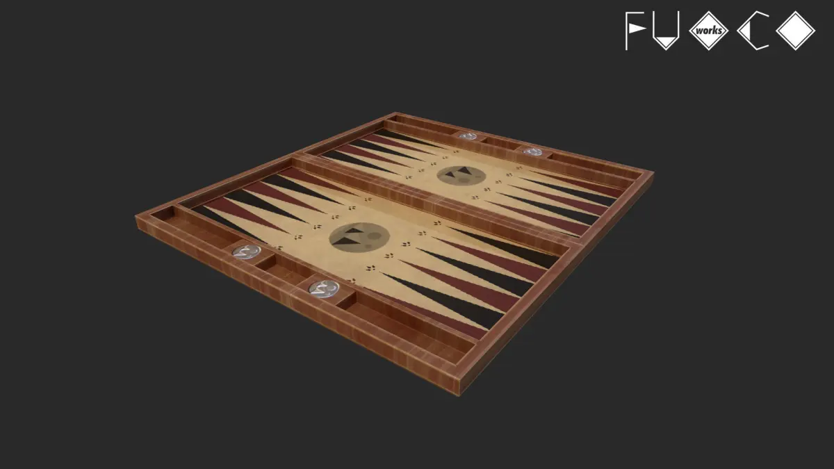 Backgammon board game set 3D Model. 39 individual objects (checkers, cover, base, dice, cups; so, you can easily move, rotate animate or use them as game assets, if you want) Quads only geometries (no tris/ngons).