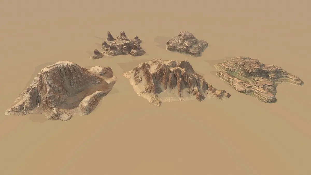 Background Landscapes Desert Sand include 5 low poly models each have textures: color(alpha-AO) and normal map. well suited for the creation of backdrops in games, films or promotional materials.