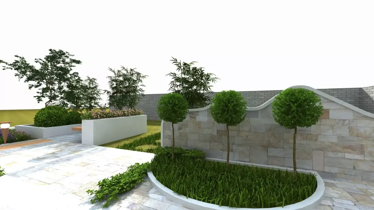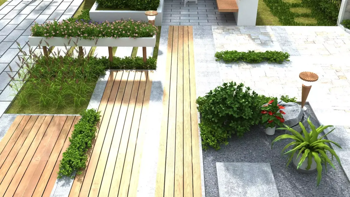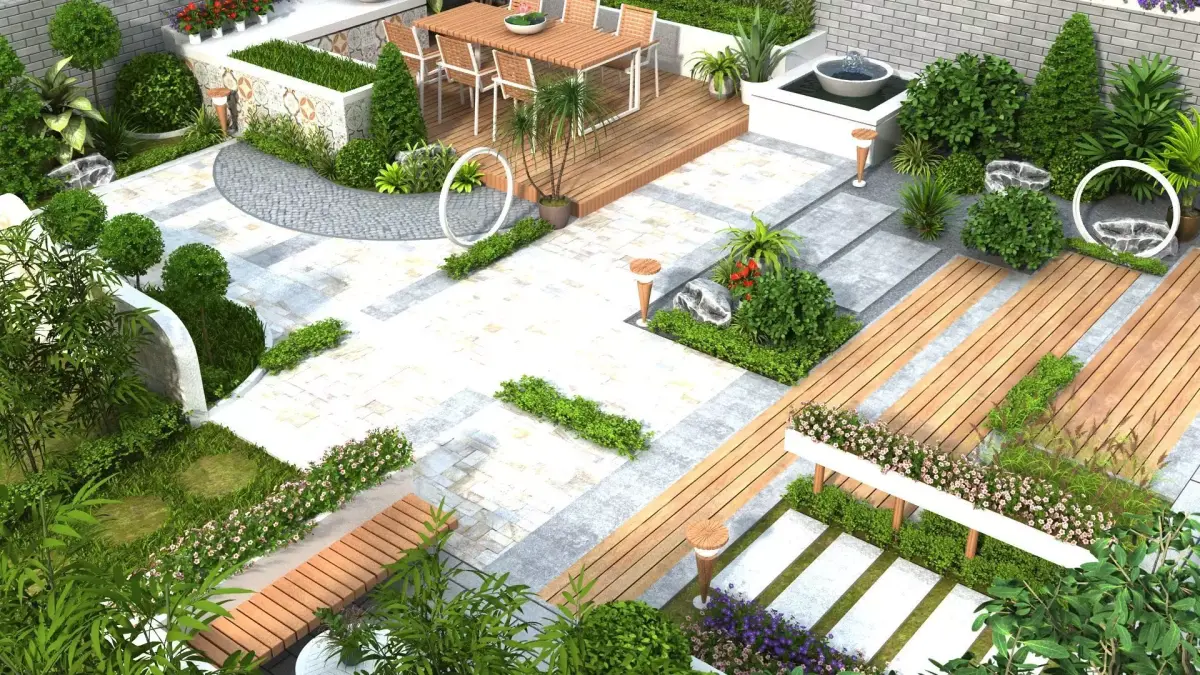 Backyard concept: big collection of plants, patio set, various decorative items.