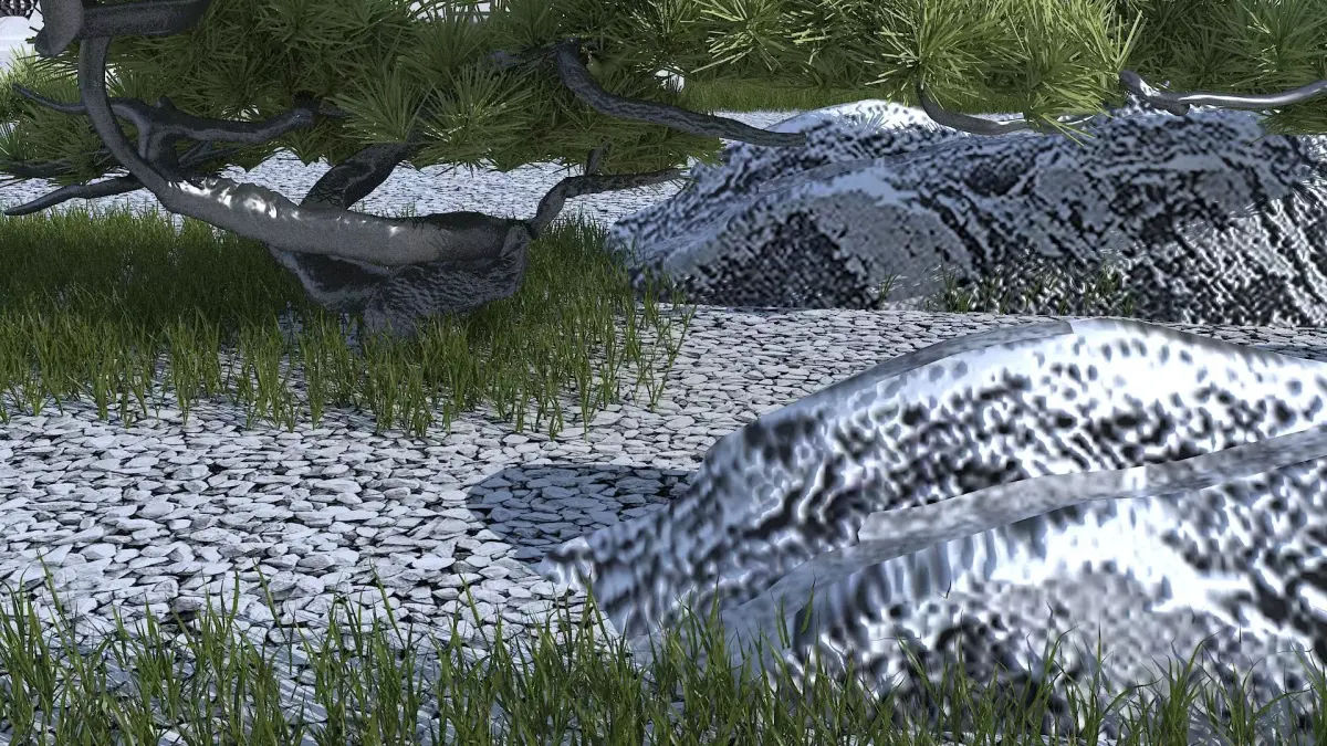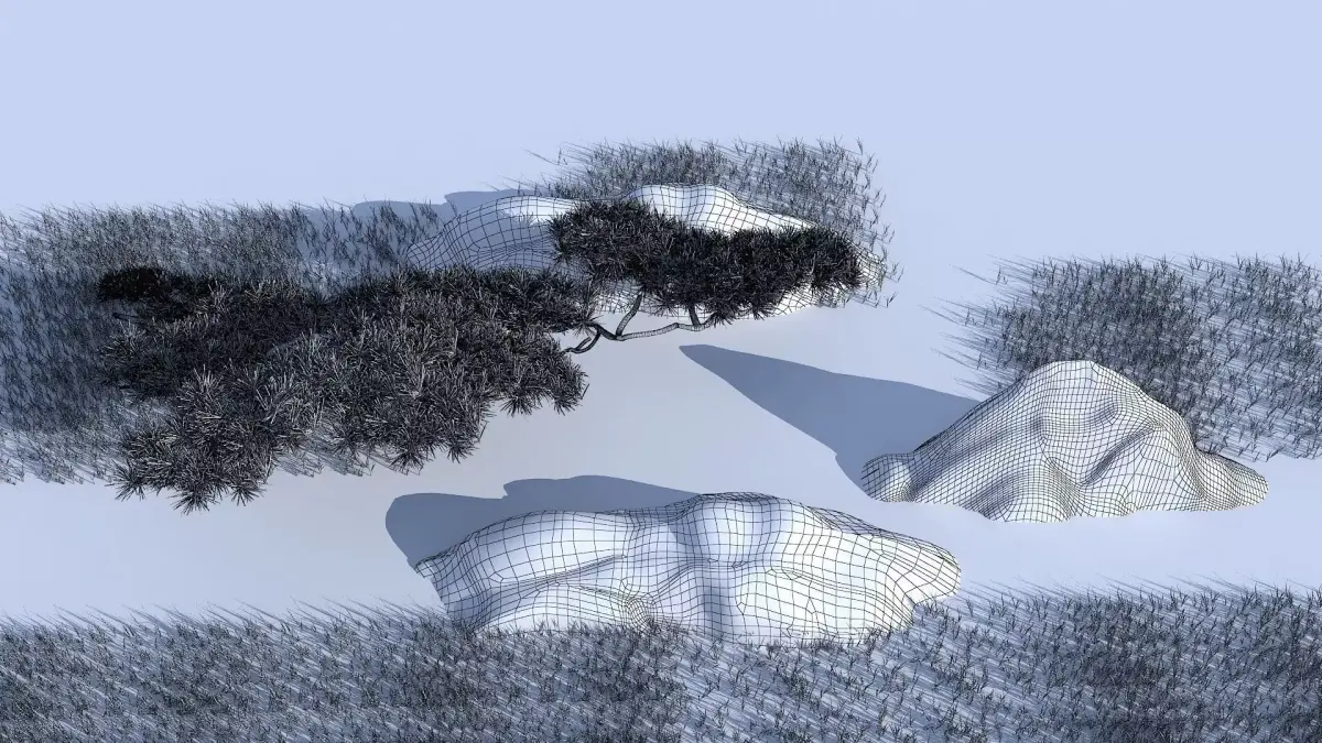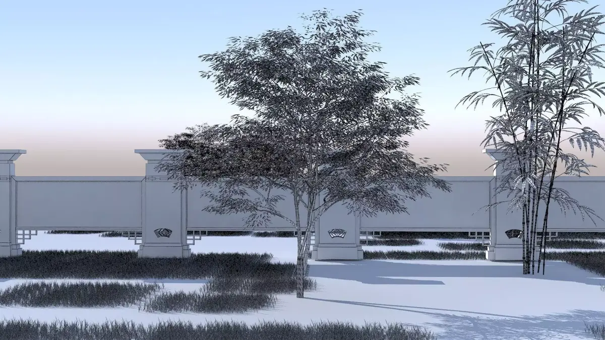 Backyard design. Trees (2 vrmesh), grass, fence/wall in Asian style.