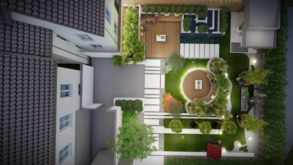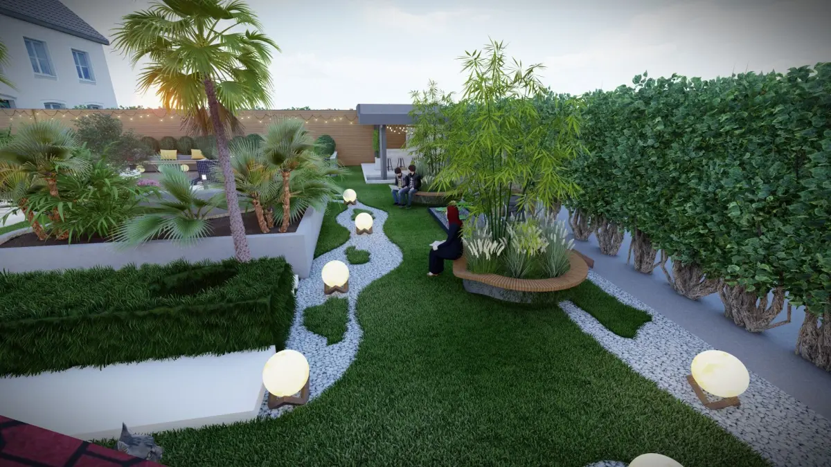 ️ Grass lawn with walkway area️ Wooden seating with planting spaces️ Cozy seating zones for relaxation️ Stepping stones leading to a BBQ area️ Small tent for shade and leisure️ Bollard lights and garden lights for ambiance