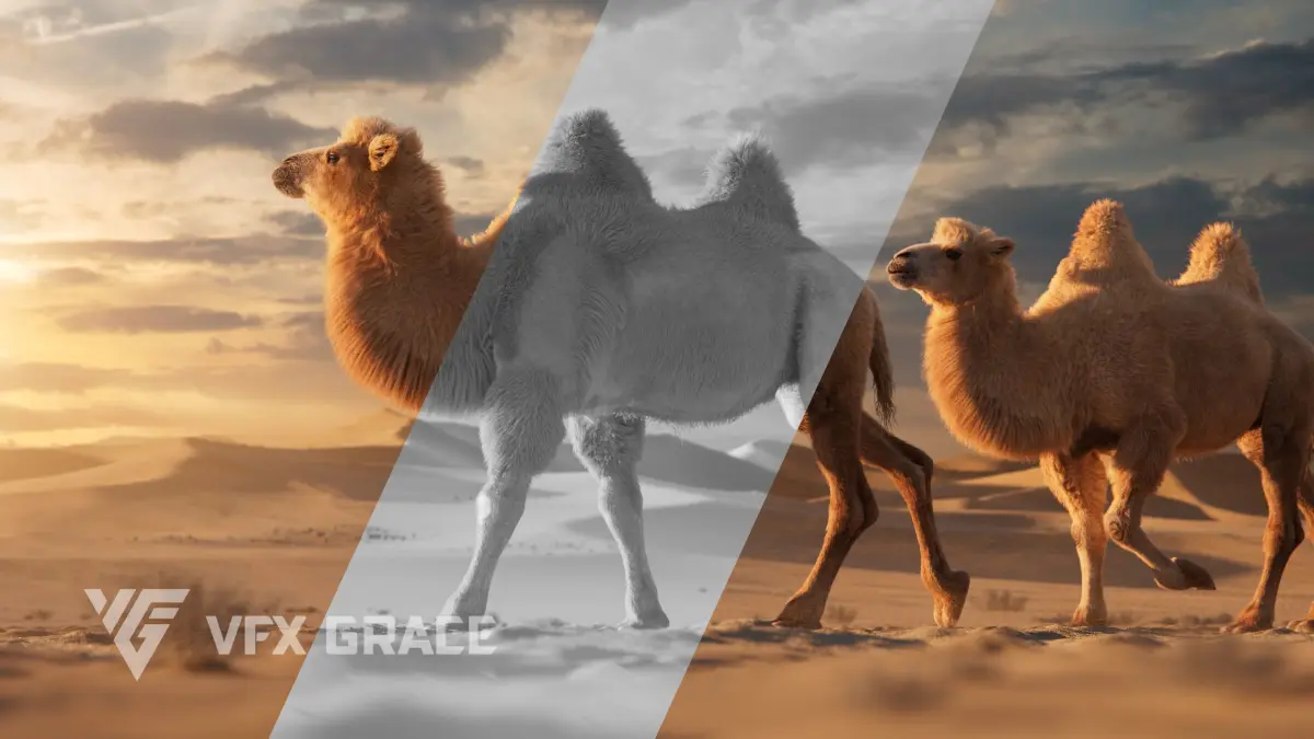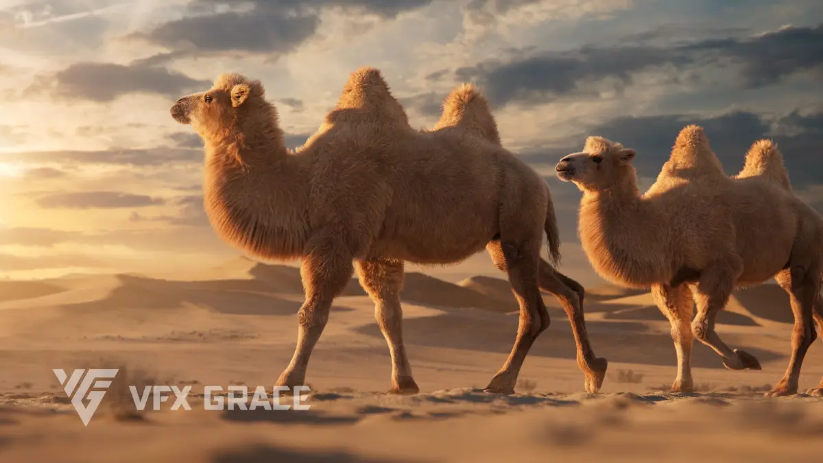 Groom Fur: A complex fur system was created in Blender, and the bactrian camel's fur styling has been perfectly replicated using UE's Groom technology, with finely tuned materials.
