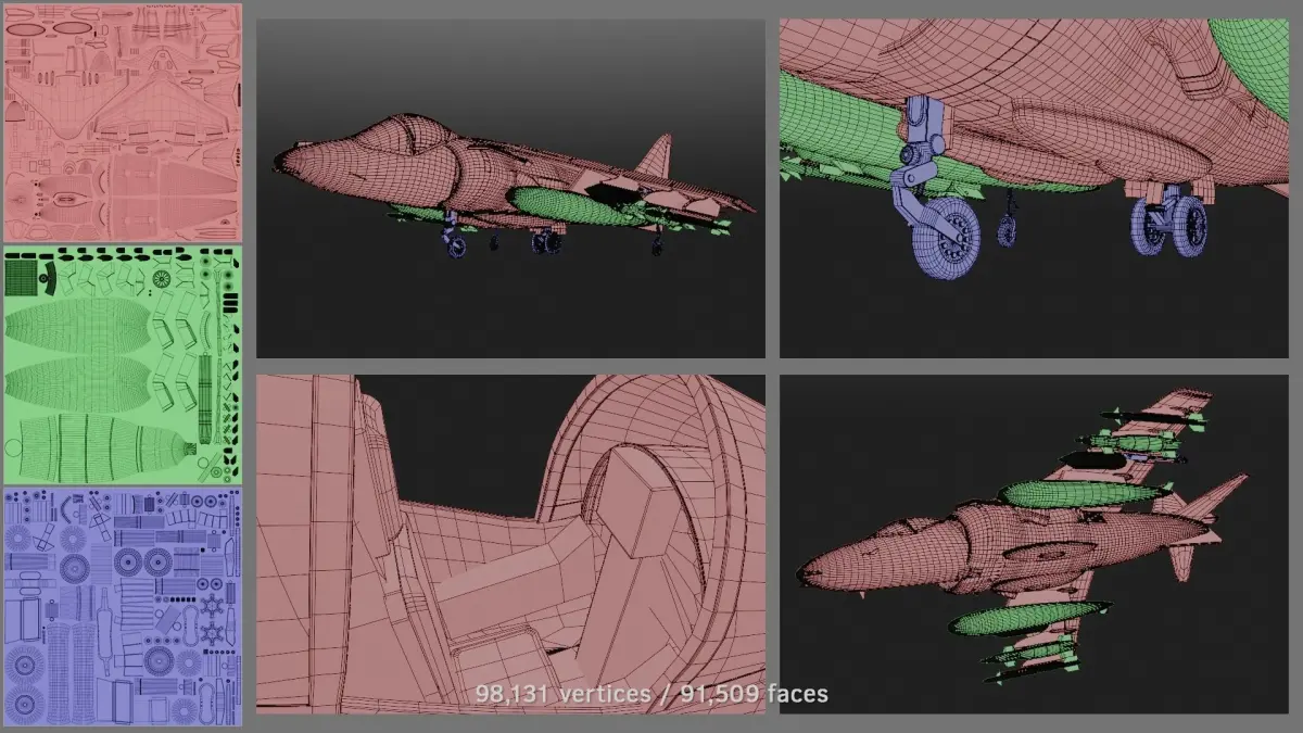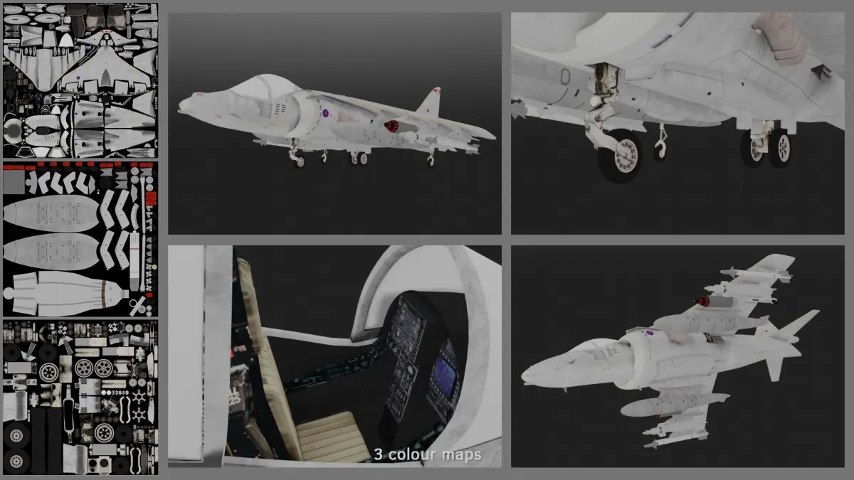 The model is fully UV unwrapped and uses three PBR materials; one for the main body of the plane, one for the undercarriage and one for the munitions loadout. The main fuselage material uses 4k textures, the undercarriage and loadout materials both use 2k. All three materials have colour, metallic, specular, roughness and normal maps; in addition the fuselage and undercarriage materials also have emission and transparency maps.
