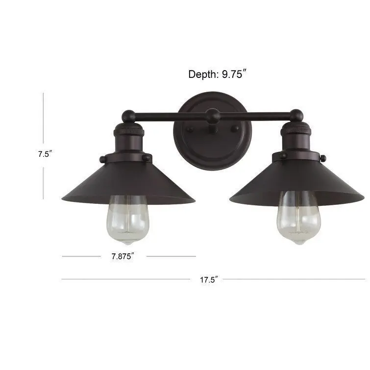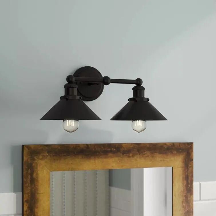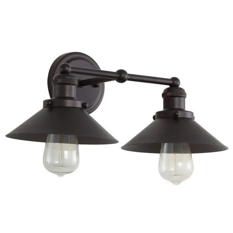 - Brighten up your bathroom in classic industrial style with this two-light vanity light. Crated of metal in a blackened bronze finish, this fixture features a round backplate complete with molded edges and decorative screw caps, while a horizontal arm suspends two milled pendant holders.