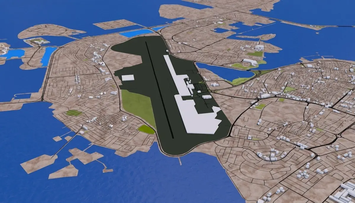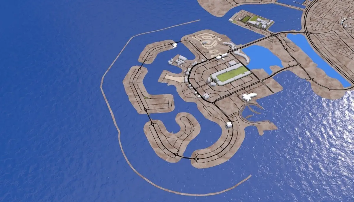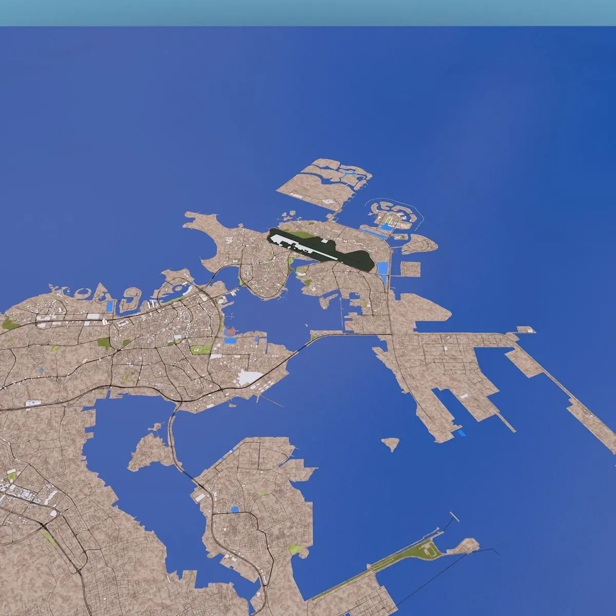 3D representation of Bahrain including Manama using 2019 map data. Roads, railway, land, water, buildings are made using real world data. Buildings are accurately placed and resembles the real world object up to some extend. Please note that random buildings (varying height) are added to those area where real world data is not available.