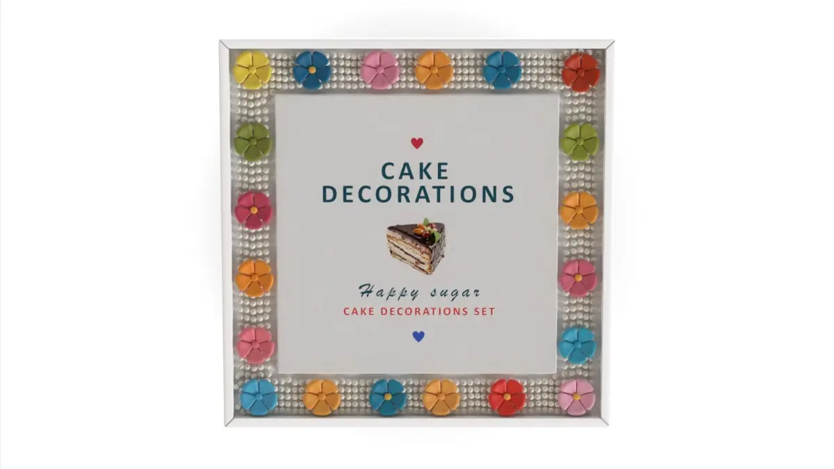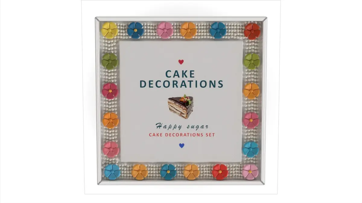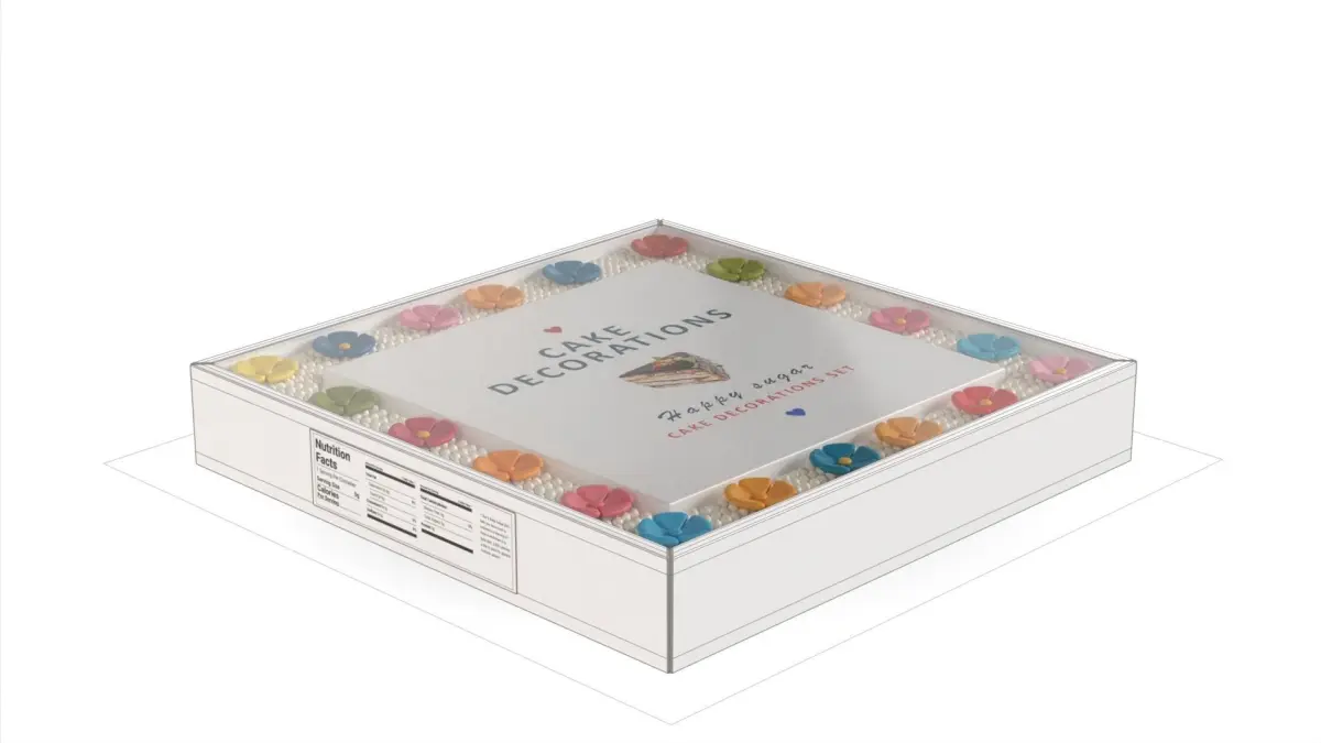 This 3D model showcases baking decorations within a white box, accurately designed with polygonal shapes, ensuring precise representation and detailing.
