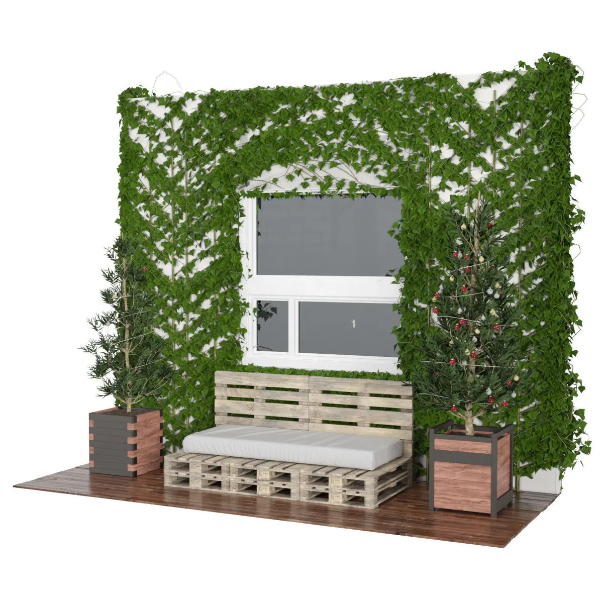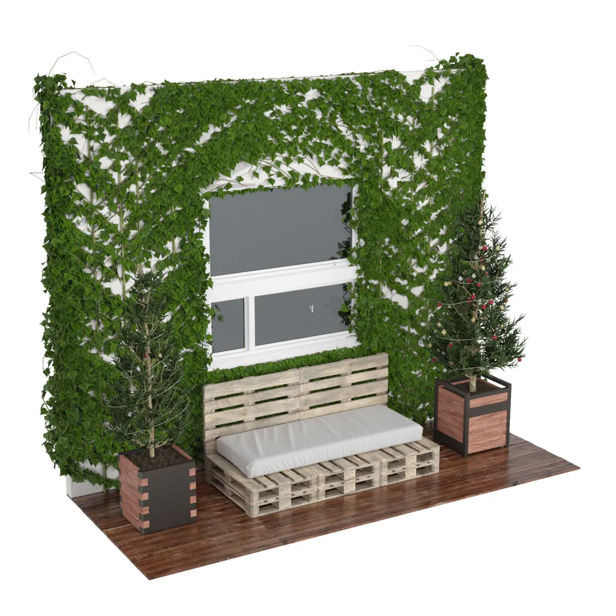 highly detailed 3d model of cozy balcony and inviting space, perfect space design to enjoy the outdoor, The balcony is made of wood and and decorated with ivy on the wall and around the window. The ivy is green and lush, and it provides a touch of nature to the balcony. There is a rustic sofa and two Christmas conifer planter on the balcony, and they are also decorated. with ivy.