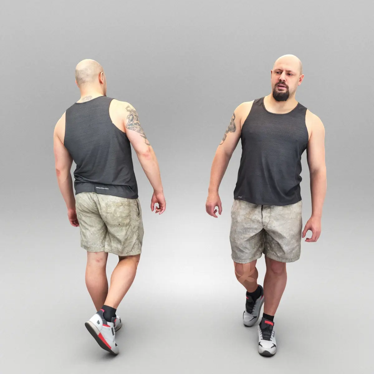 This is a true human size and detailed model of a sporty handsome young man of Caucasian appearance dressed in a sportswear. The model is captured in a casual pose to be perfectly matching to various architectural and product visualizations as a background, mid-sized or close-up character on a sport ground, gym, park, VR/AR content, etc.