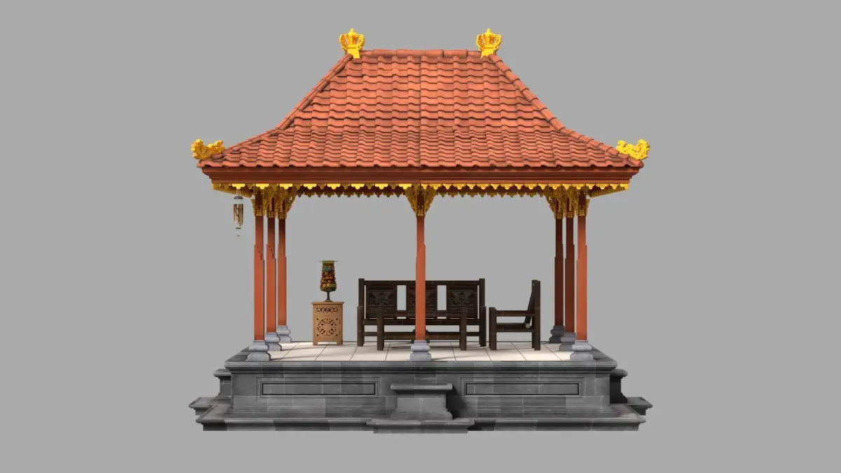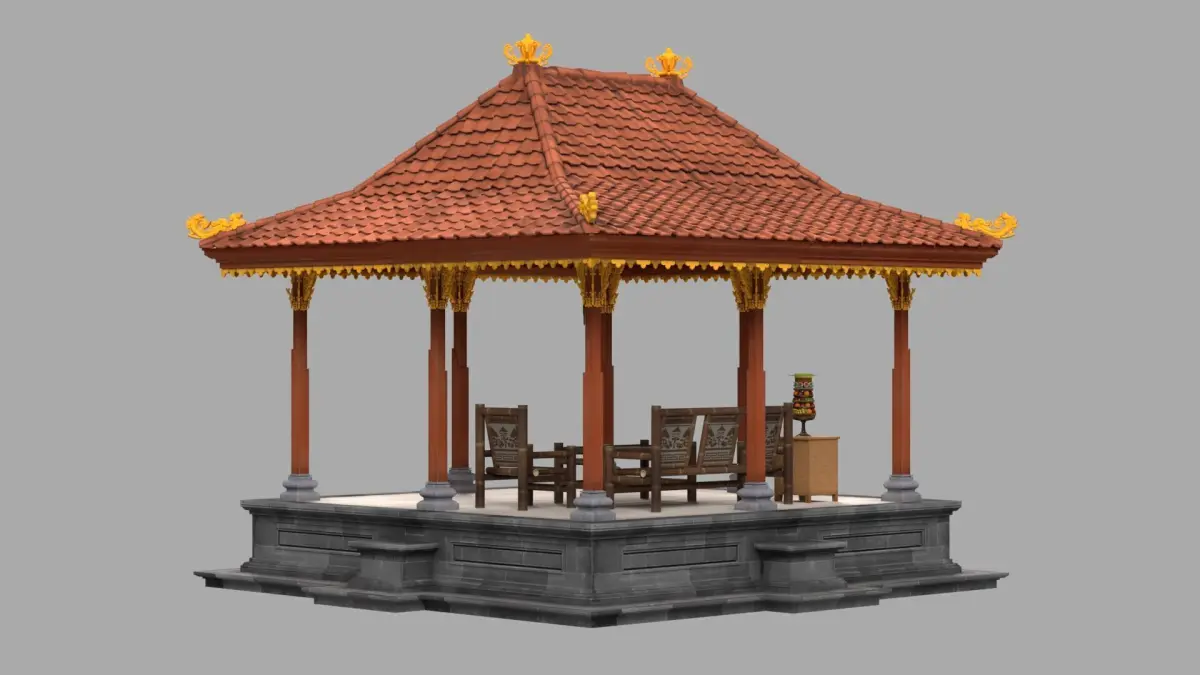 "A key structure in Balinese family compounds, this Bale Dangin represents formality and cultural heritage. Ideal for temple courtyards or residential scenes rooted in tradition.