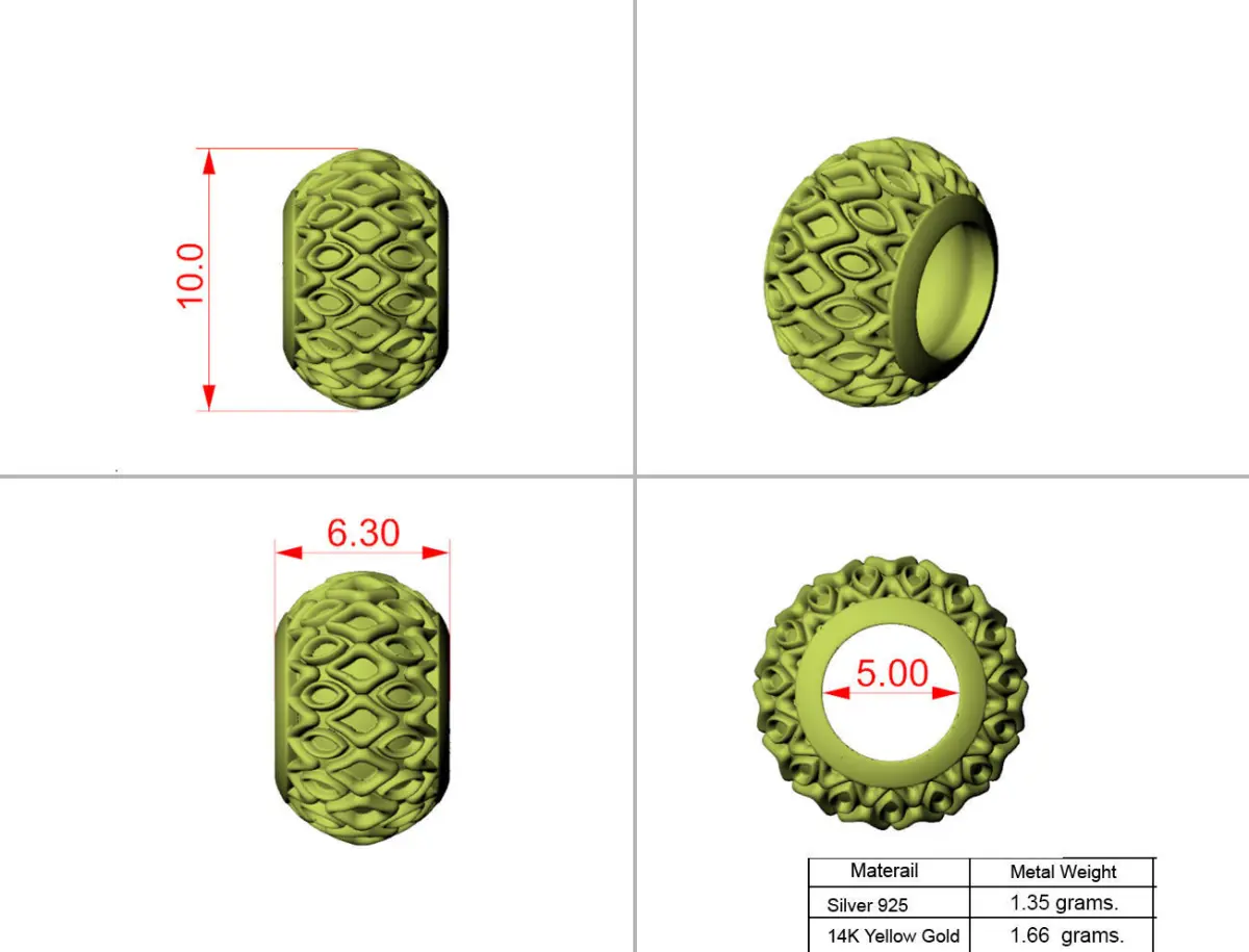 Bead size10 mm.x 6.3 mm. Hole 5 mm.Weight Silver 925=1.35 grams.14K Yellow gold= 1.66 grams.Jewelry pendants, tubes, charms on the bracelet. Pendants printed, everything was fine. perfect for professional 3d modelers to work. Also among the files there is a format stl, perfect for jewelers to immediately print and put into production.