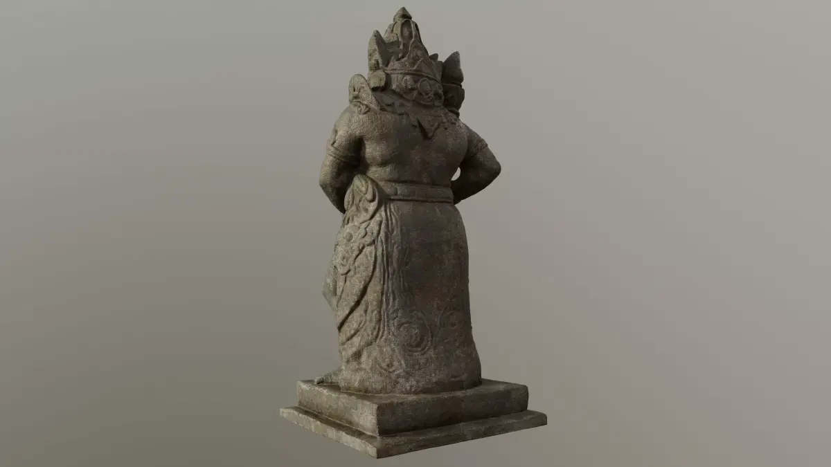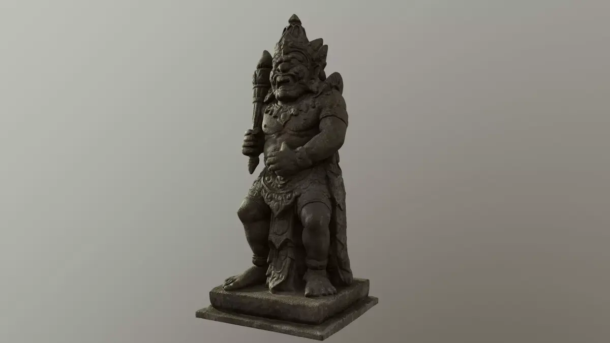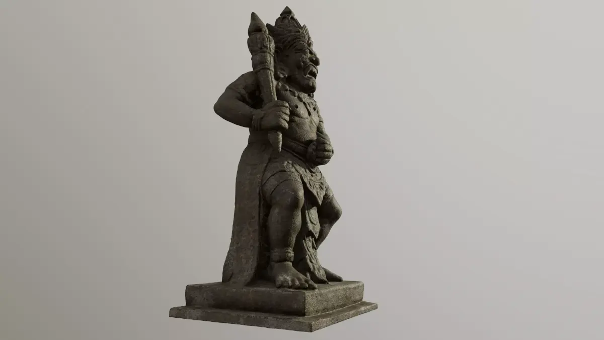Temple Guardian Statue – 3D ModelThis high-quality 3D model depicts a fierce temple guardian, inspired by traditional Southeast Asian protective statues found at shrine entrances and ancient gateways. The character features a powerful stance, exaggerated facial expression, ornate headdress, and ceremonial mace held firmly in one hand. Decorative carvings, layered cloth, and muscular anatomy give the figure a bold and imposing presence.