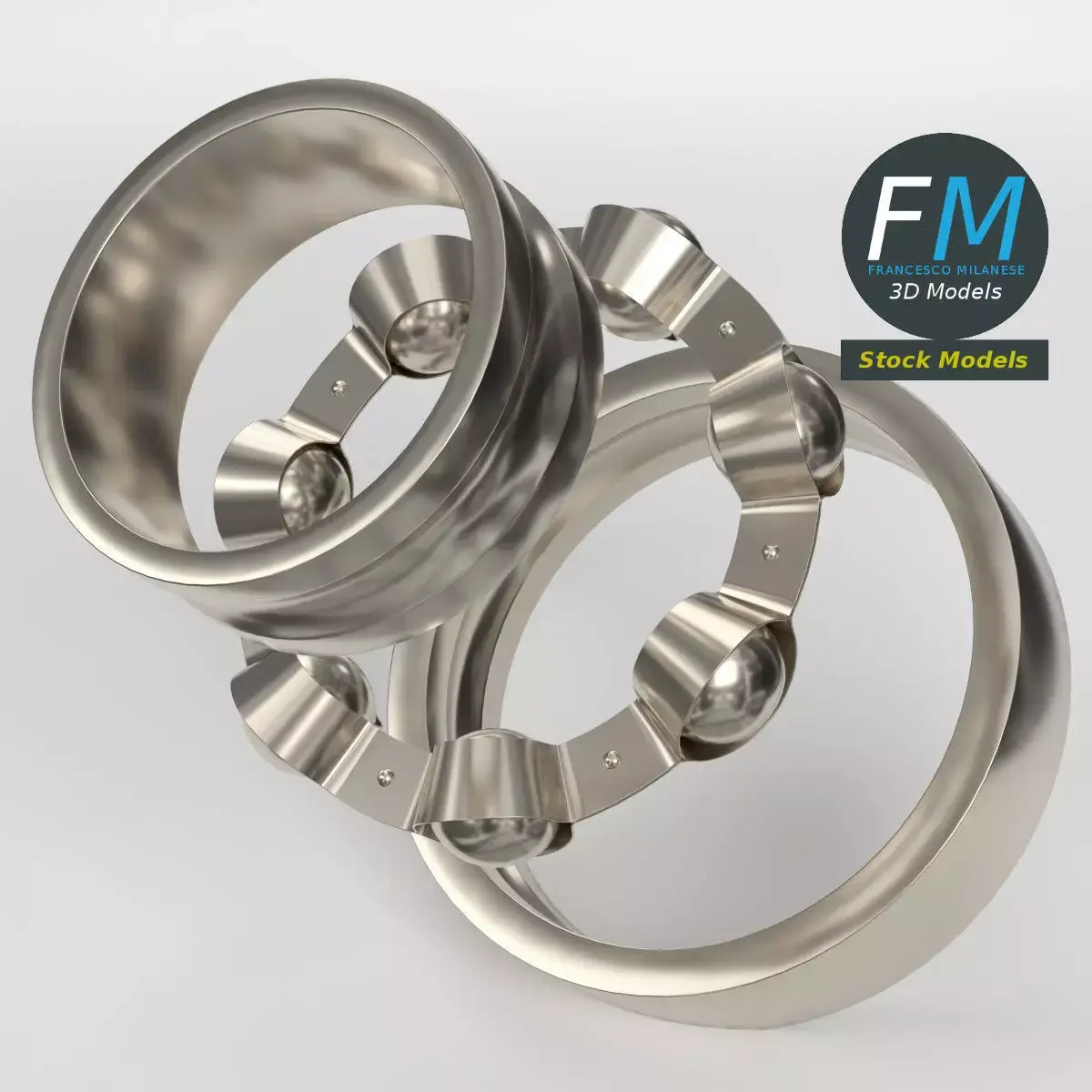 A realistic 3D Model of a precision ball bearing featuring a polished metal finish, circular race design, and evenly spaced internal rolling elements, suitable for mechanical assemblies, industrial visualizations, engineering renders, and game or simulation environments. 3 individual objects (outer race, inner race, cage and balls; inner race is parented, together with cage and balls, to the outer race, so outer race is supposed to be stationary, while other objects rotate), sharing the same non overlapping UV Layout map, Material, and PBR Textures set. Production-ready 3D Model with non overlapping UV Layout map provided in the package. PBR Materials and Textures (Metallic Workflow: Base Color, Metallic, Roughness, Normal) embedded in the Blend, FBX, and GLB files.Easily customizable: UV unwrapped geometries; UV Layout maps provided in the package as png with alpha images.Quads-only geometry.Made with Blender 4.5 with Cycles Principled BSDF (PBR, Metallic Workflow) Material, then exported to other formats (OBJ, FBX, GLB; FBX and GLB have embedded textures).Promo images: some renderings made with Cycles for Blender, plus Wireframes and Blender screenshots (Object Mode, Edit Mode with UVs).Formats included: FBX with embedded PBR Textures (Metallic Workflow: Base Color, Metallic, Roughness, Normal), GLB with embedded PBR Textures (Metallic Workflow: Base Color, Metallic, Roughness, Normal), OBJ; scenes: BLEND (with Cycles Principled (PBR) Materials); other: 16-bit PNGs with Alpha.3 Objects (meshes), 1 PBR Material, UV unwrapped (non overlapping UV Layout map provided in the package).UV Layout maps and Image Textures resolutions: 2048x2048.Polygonal, QUADS-ONLY, 10426 vertices, 10398 quad faces (20796 tris).Real world dimensions; scene scale units: METERS in Blender 4.5 (that is: Metric with 1.00 scale).Uniform scale object (scale applied in Blender 4.5).PBR Textues included: in a zipped folder, you'll find the PBR Textures set (as 16-bit PNGs with Alpha).IMPORTANT --- Main renderings made with Blender 4.5 + Cycles using an HDR Environment Texture Image which is NOT provided in the package!