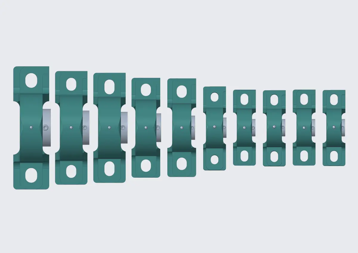• Pillow block bearing units are the most popular housing design for mounted bearings. Featuring a one-piece cast iron housing they are designed to support loads primarily directed through the base. The two bolt holes are slotted for adjustment during mounting. Units are prelubricated and designed to slip fit on to the shaft. Setscrew type fixed to the shaft by means of the setscrews prepared in the wide inner ring.