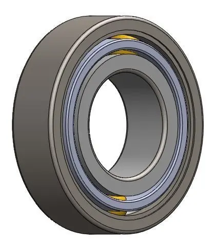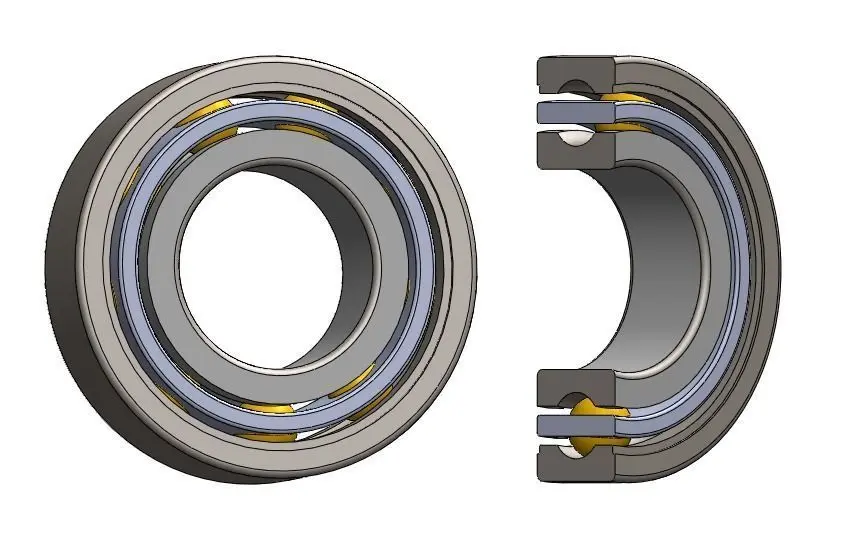 An assembly of a ball bearing with a full cage modeled in Solidworks. The material is applied in Solidworks for each component.