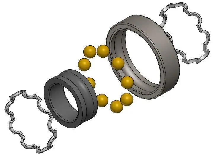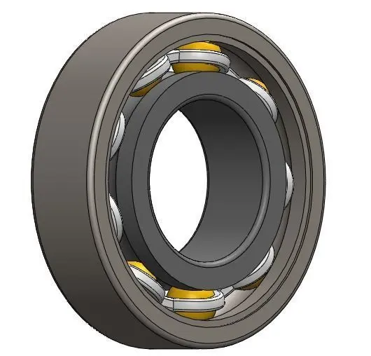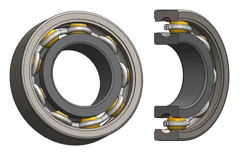 Ball bearing modeled in Solidworks. This type of bearing has a small cage.