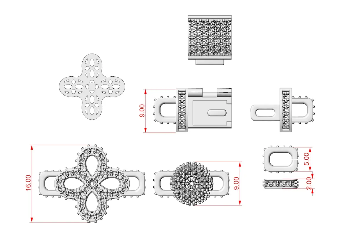 The model includes different sizes of gemstones but is designed with the appropriate parameters for proper manufacturing.