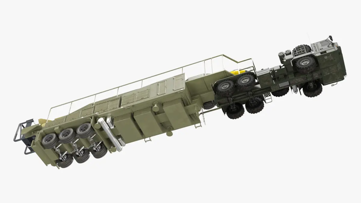 Ballistic Missile on TEL Trailer with Tractor Hauler Rigged for Maya is fully rigged and is ready to be animated in Maya. You can easily position it the way you need or animate it the way your project requires. See the screenshots to get an idea of how rigging works. The pose of the model on the render images is an example and can be recreated using rig, it is not initially included into the product.
