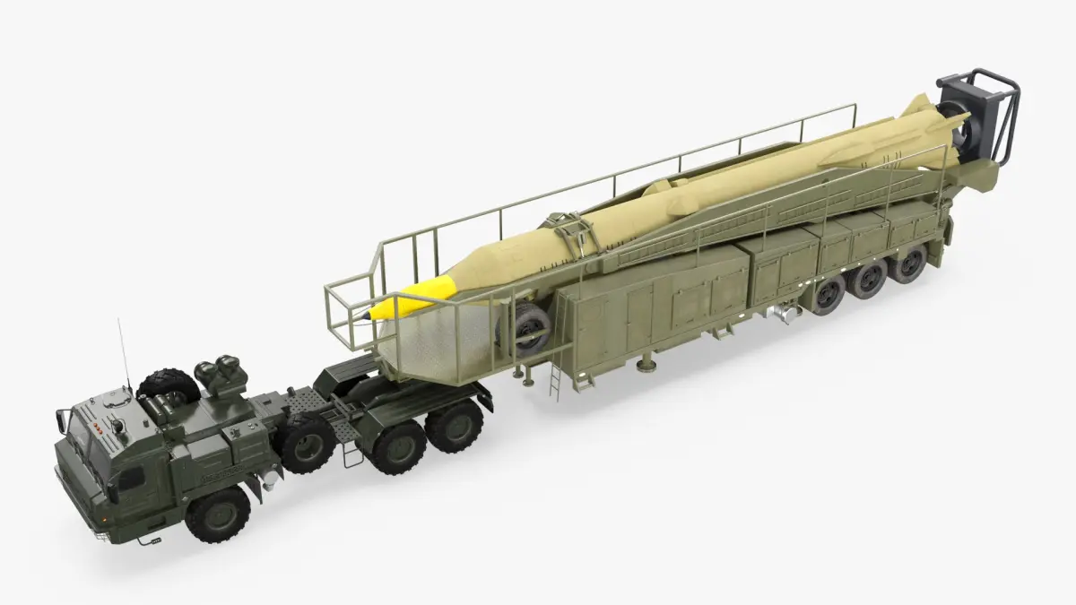 This model represents a heavy-duty vehicle equipped with a launch system integrated onto a multifunctional chassis. The launcher is designed to be robust and reliable, offering mobility for rapid deployment. It features advanced targeting systems and stabilization technologies for precise missile launches. The design includes a cab for operators, reinforced for protection and equipped with communication systems.
