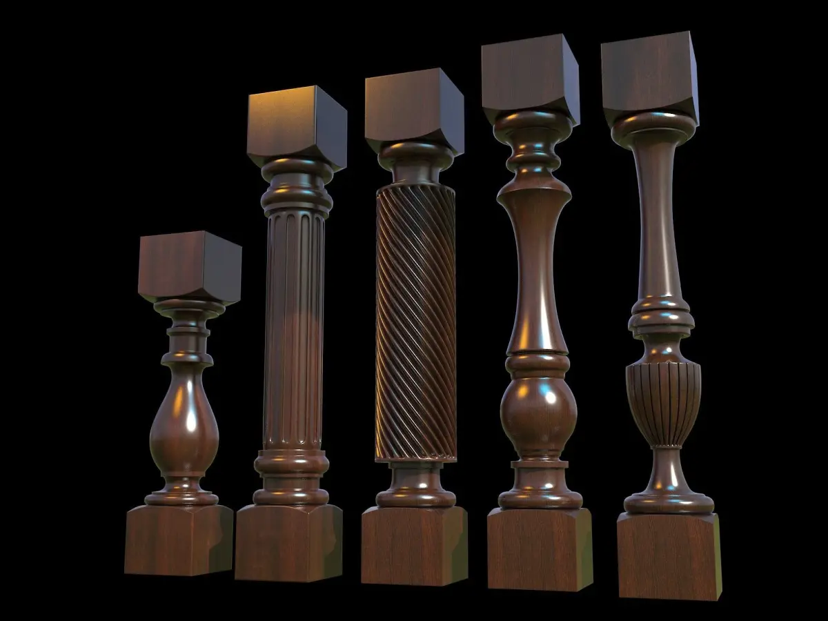 A baluster is a vertical moulded shaft, square, or lathe-turned form found in stairways, parapets, and other architectural features. In furniture construction it is known as a spindle. Common materials used in its construction are wood, stone, and less frequently metal and ceramic. A group of balusters supporting handrail, coping, or ornamental detail are known as a balustrade.