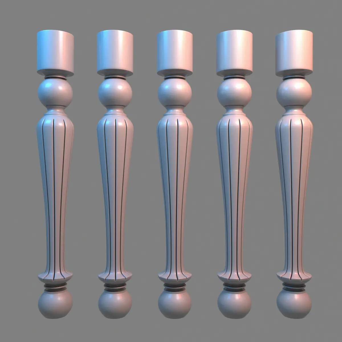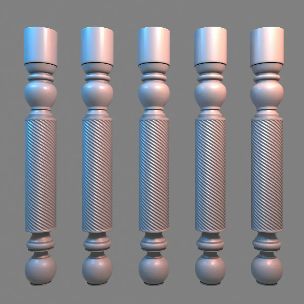 A baluster is a vertical moulded shaft, square, or lathe-turned form found in stairways, parapets, and other architectural features. In furniture construction it is known as a spindle. Common materials used in its construction are wood, stone, and less frequently metal and ceramic. A group of balusters supporting handrail, coping, or ornamental detail are known as a balustrade.