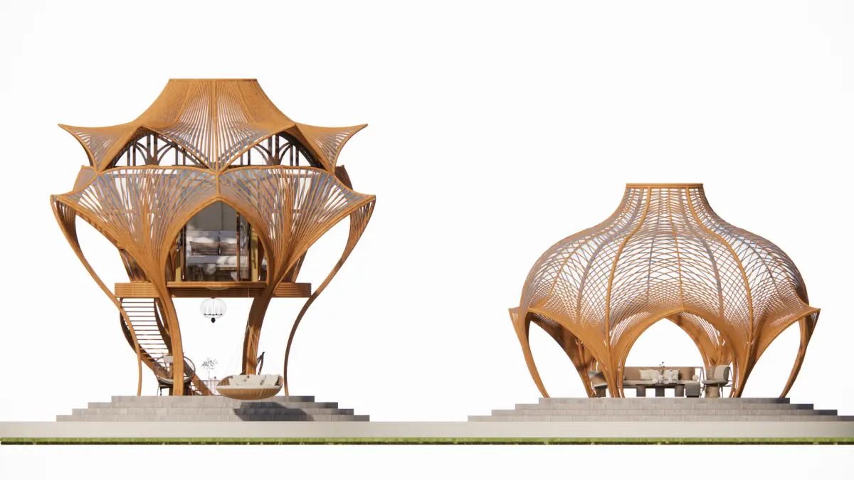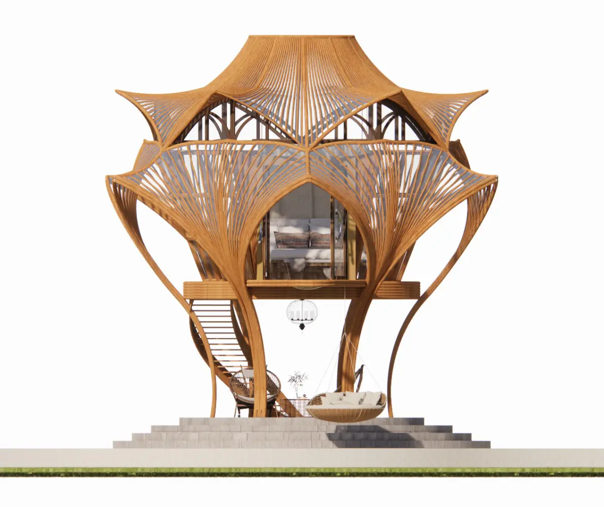 Bamboo House: Floral Canopy PavilionCore DesignForm: Biomimetic flower-inspired 3-tiered structure with spiral bamboo staircase (Ø1.8m)Framework: Curved bamboo ribs (ISO 22157 certified) forming petal-like platformsKey Features:Ground floor: Suspended rattan swing area (load capacity 300kg)Mid-level: Open-air meditation deck with bamboo lattice shadingTop floor: Glass-bottom observatory (6mm tempered glass)Material Tech:UV-resistant membrane roofing (UPF50+ rating)Bamboo-concrete composite footings (anti-termite treatment)