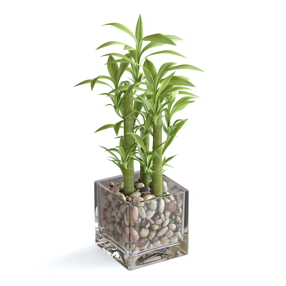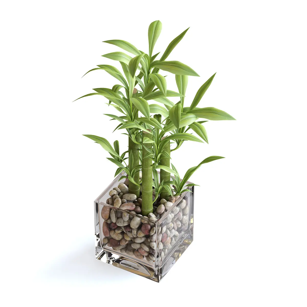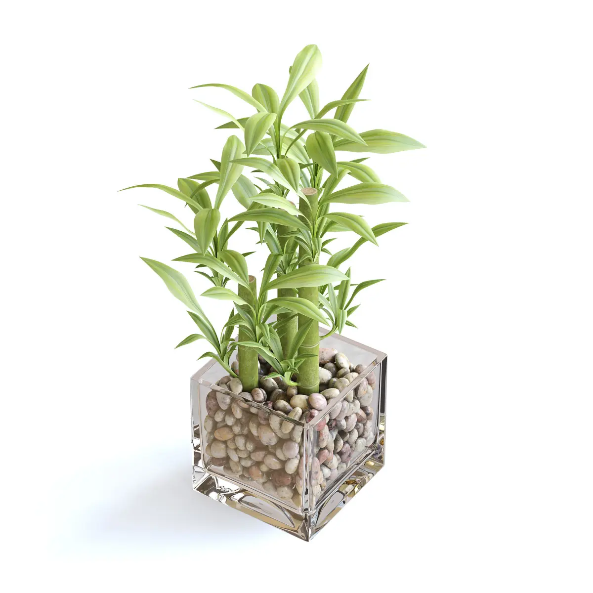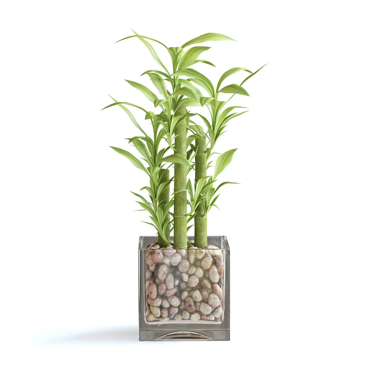 Bamboo plant in glass rectangular vase filled with pebbles.