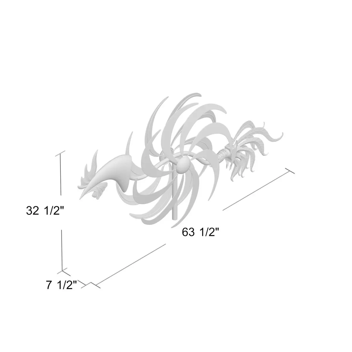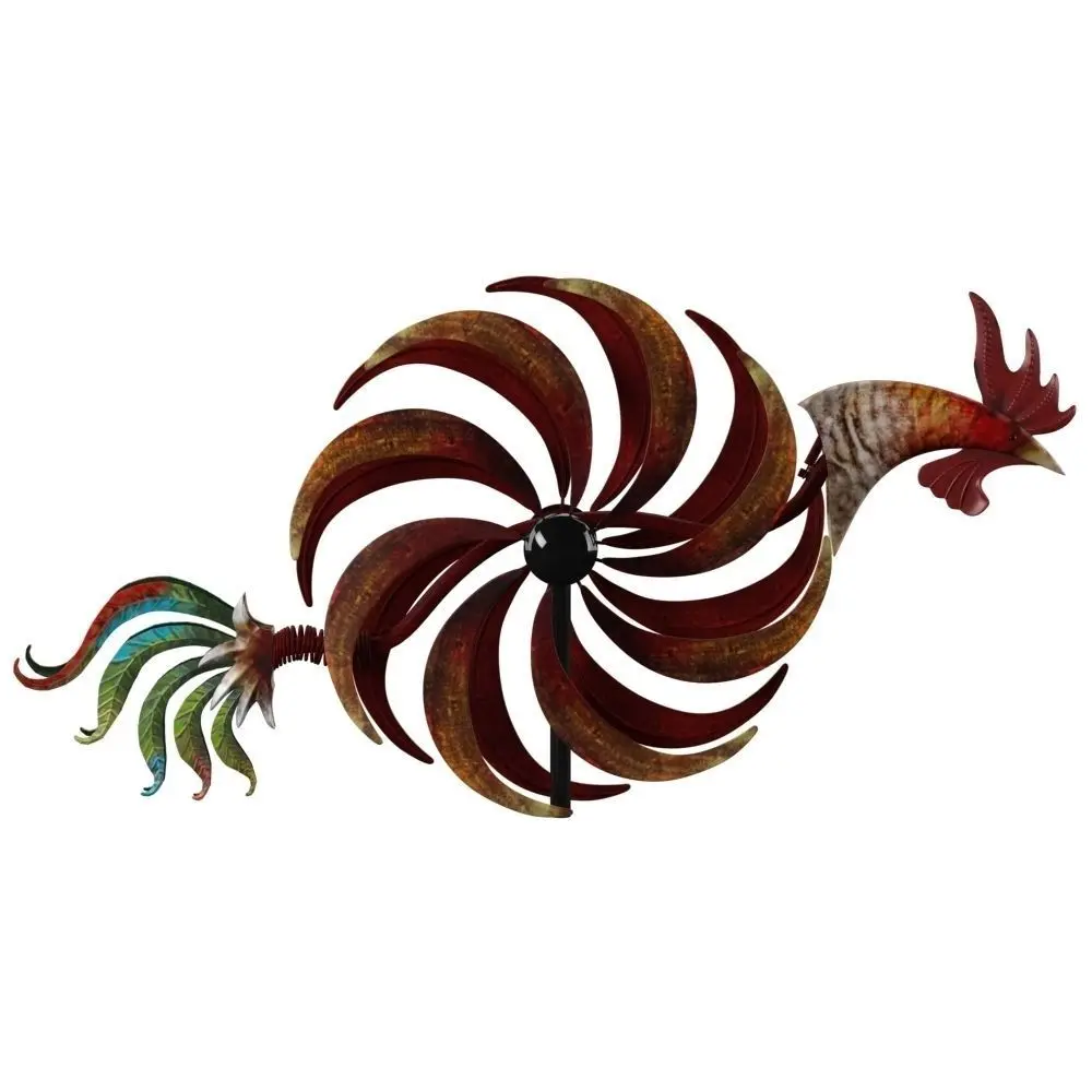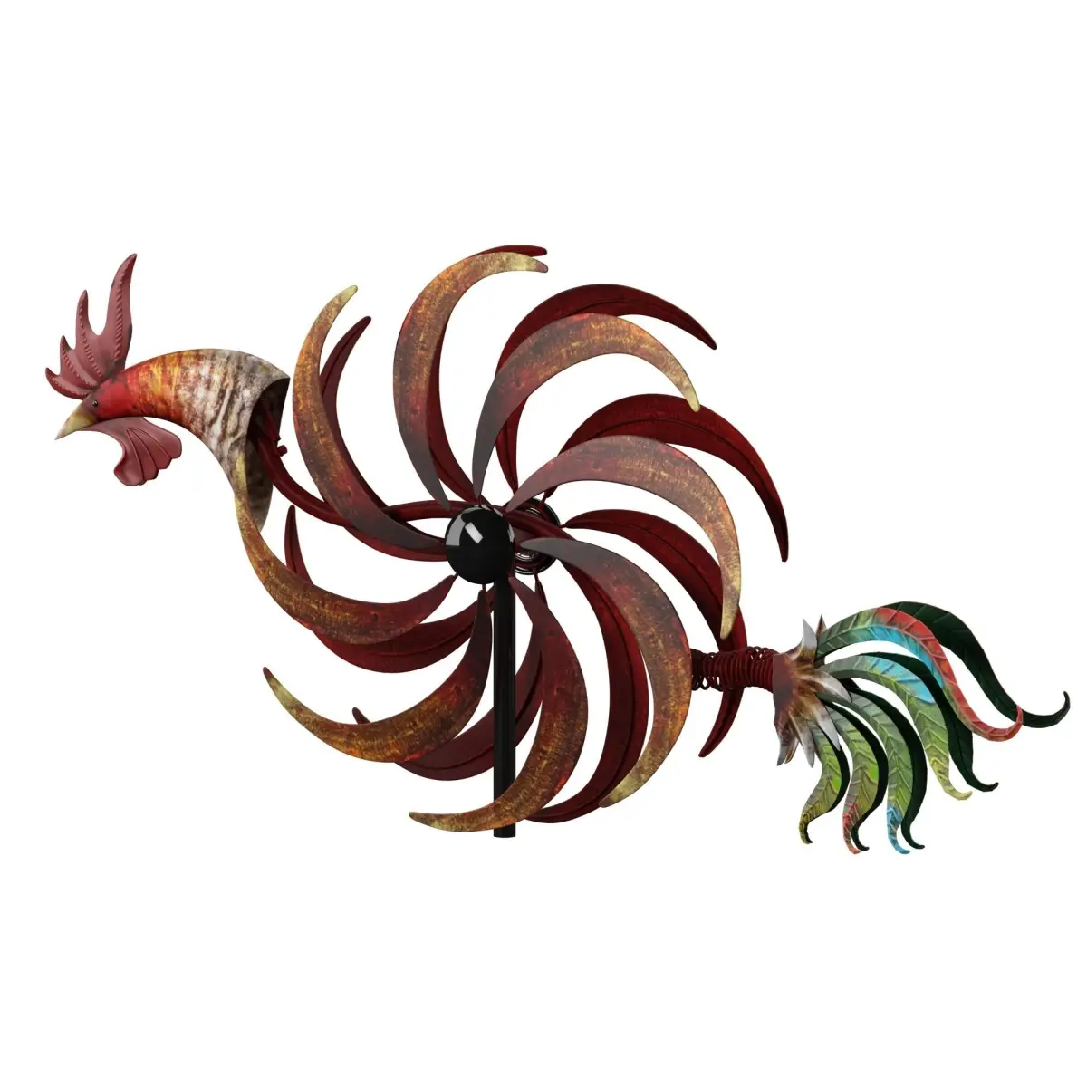 Cock-a-doodle-doo! Give your garden something to crow about with this flaming rooster wind spinner! Crafted of weather-resistant steel, this wind spinner features an adorable rooster design. Springs prop up its red comb and wattle-adorned head and rainbow-hued tail feathers, while a rotating mechanism helps its curved feathers to spin 360° in light wind. Measuring 63.5H x 30.75 W x 6.75D overall, this spinner arrives with a post and an H-base for easy placement in your lawn or garden.Overall Height - Top to Bottom: 63.5Overall Width - Side to Side: 30.75Overall Depth - Front to Back: 6.75Cock-a-doodle-doo! Give your garden something to crow about with this flaming rooster wind spinner! Crafted of weather-resistant steel, this wind spinner features an adorable rooster design. Springs prop up its red comb and wattle-adorned head and rainbow-hued tail feathers, while a rotating mechanism helps its curved feathers to spin 360° in light wind. Measuring 63.5H x 30.75 W x 6.75" D overall, this spinner arrives with a post and an H-base for easy placement in your lawn or garden.