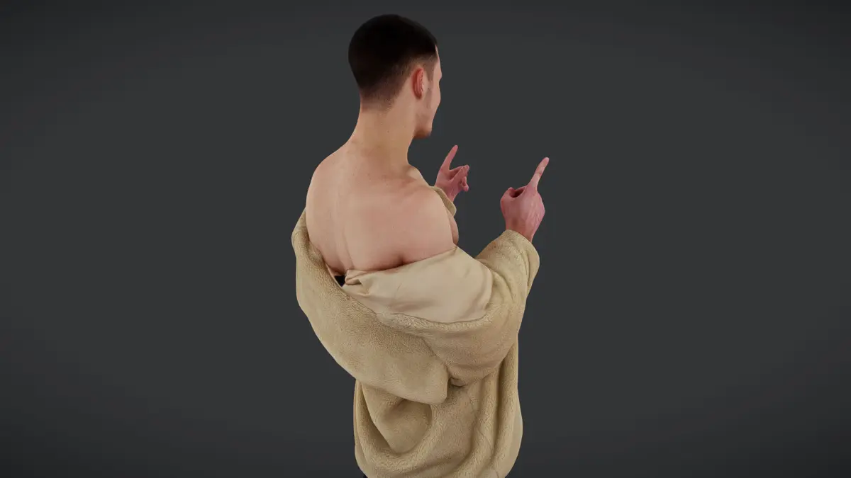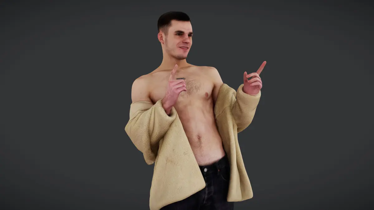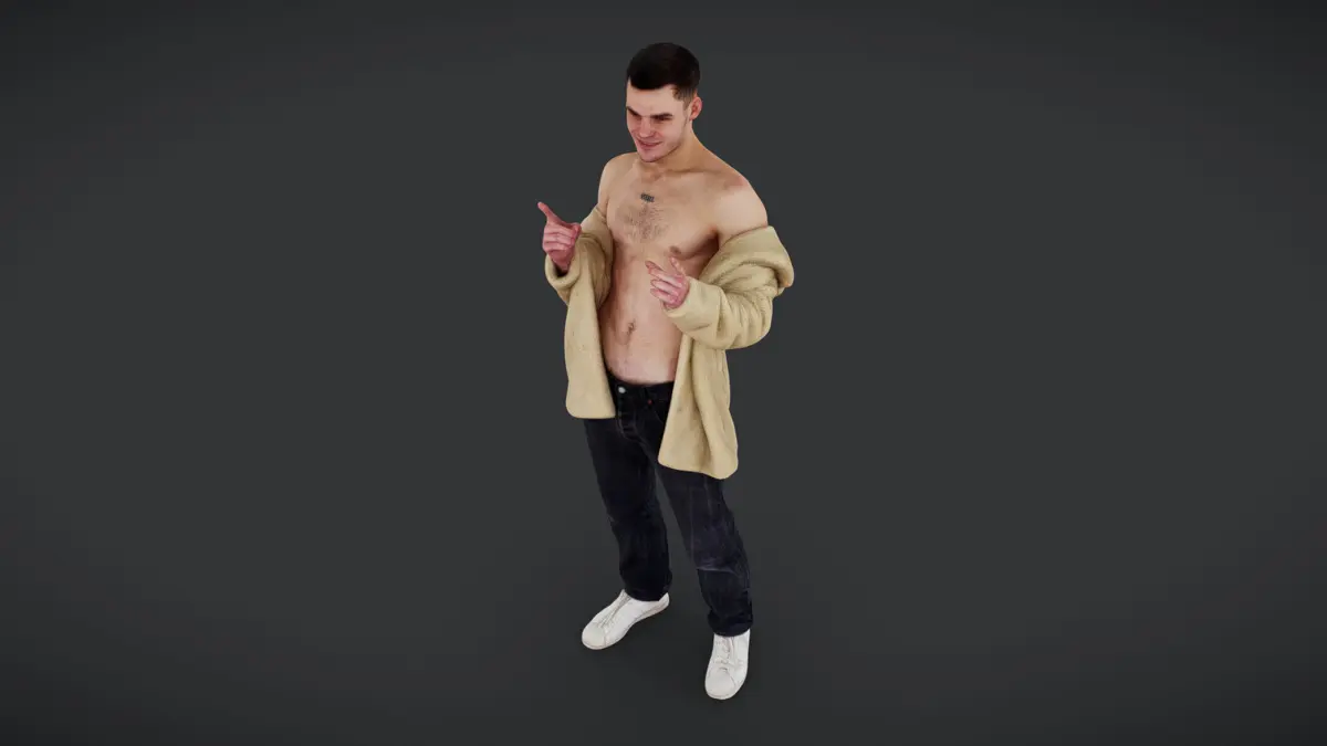 A bold and confident male figure pointing with both hands, wearing a tan open jacket, revealing his bare chest. His relaxed denim jeans and casual white sneakers add a contemporary street-style vibe. The playful and slightly mischievous expression makes him ideal for dynamic storytelling and character-driven scenes.
