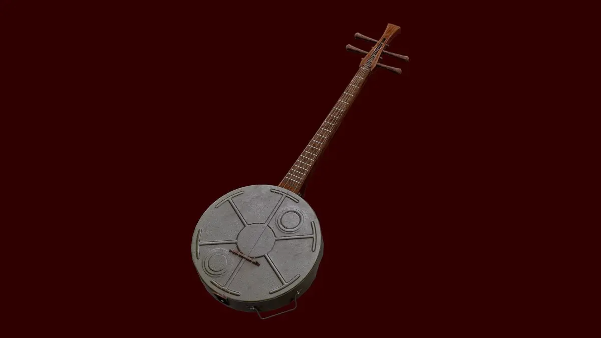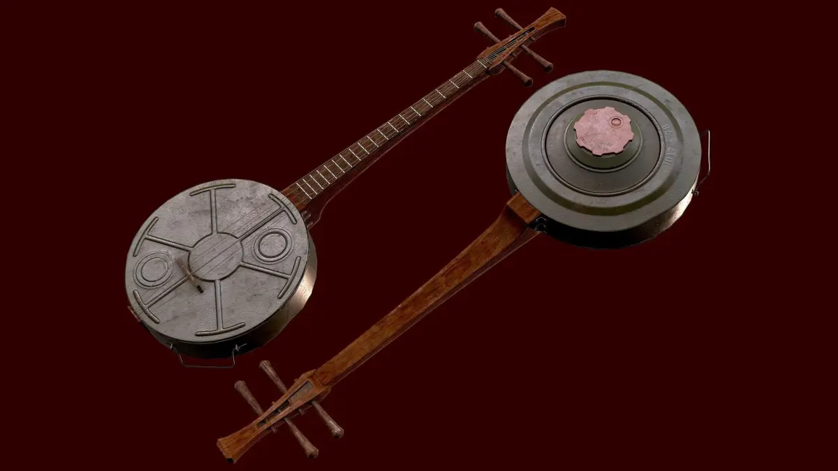Banjo made from a mine.I did the concept of this banjo, presenting it as a soldier after the battle, returning to the camp, he found an empty mine and made a musical instrument out of it because he does not want to fight, he wants to play music.
