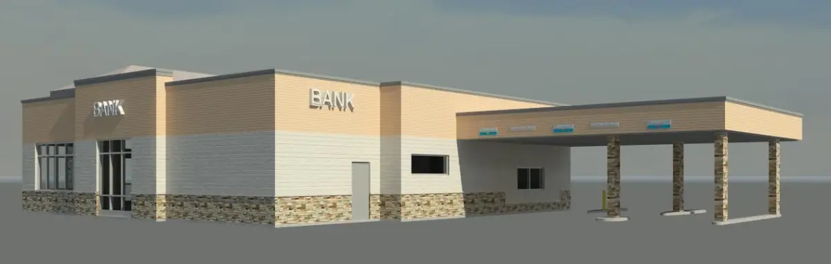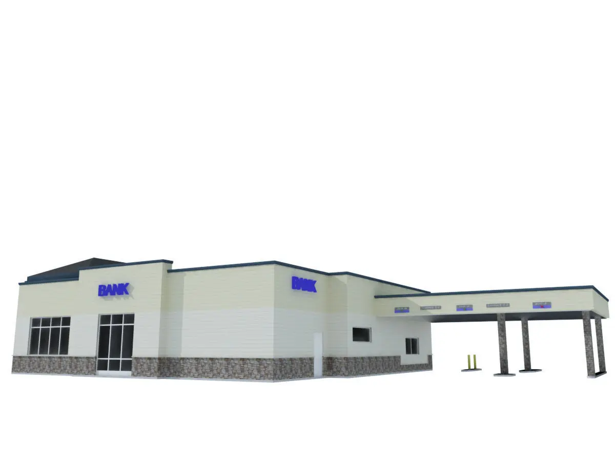 3D model of Exterior of a commercial building, could be a bank or other office but it does include a drive thru from a bank, All maps included, renderings done on lower settings, used max 9 and Vray 1.5