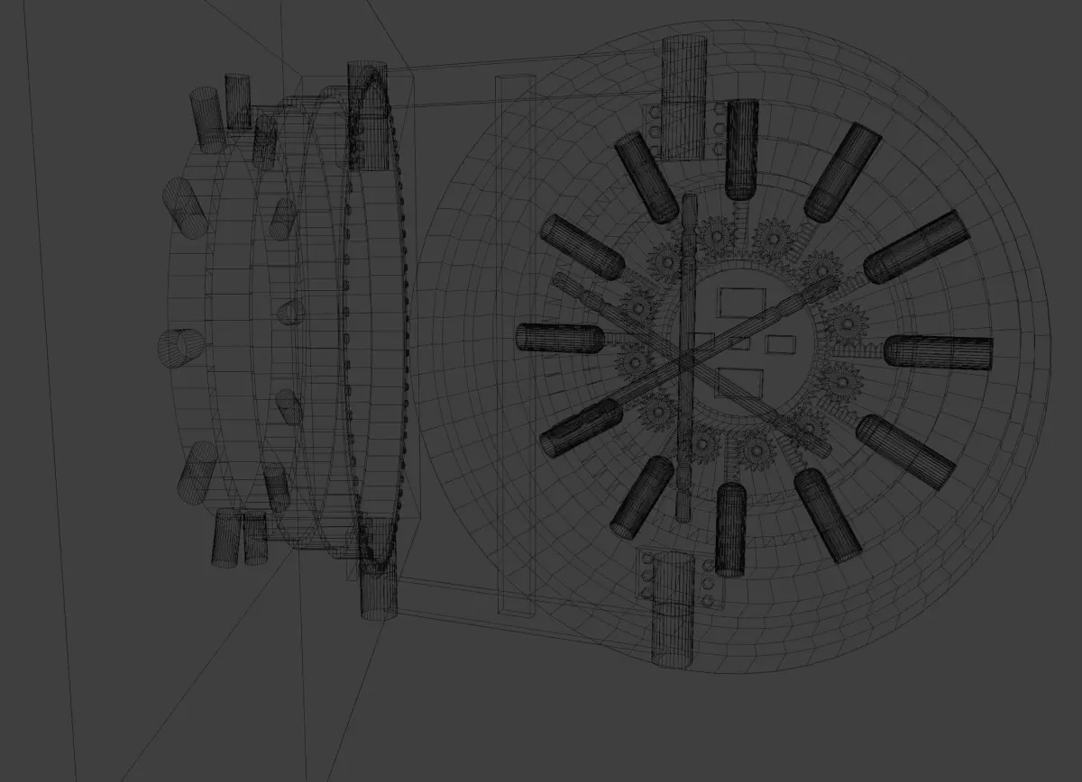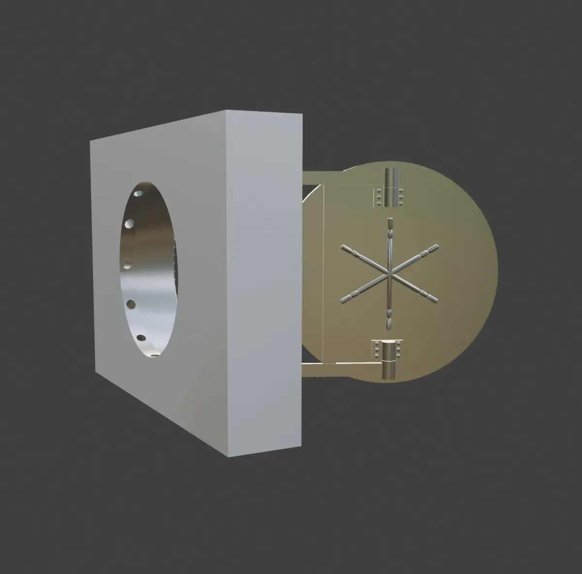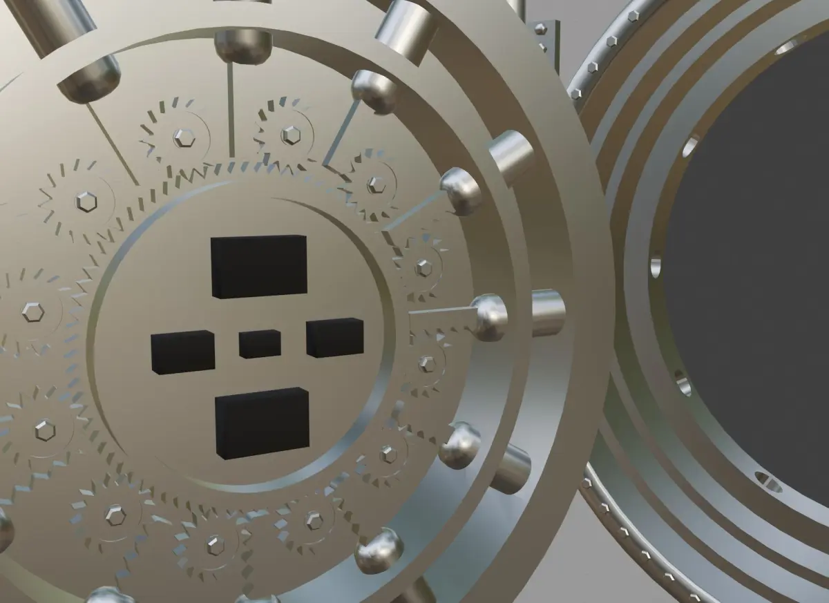 This 3D model showcases a highly detailed bank vault, emphasizing security and precision engineering. The focal point is a massive, circular steel door with complex locking mechanisms, including multiple rotating gears and a large central wheel. The door is set within a thick, reinforced frame, indicating impenetrable strength. The overall design captures the essence of a secure, high-stakes environment, perfect for scenes requiring a strong sense of protection and secrecy.