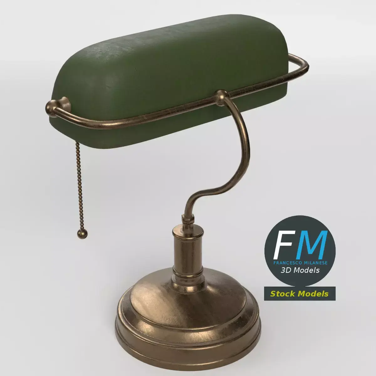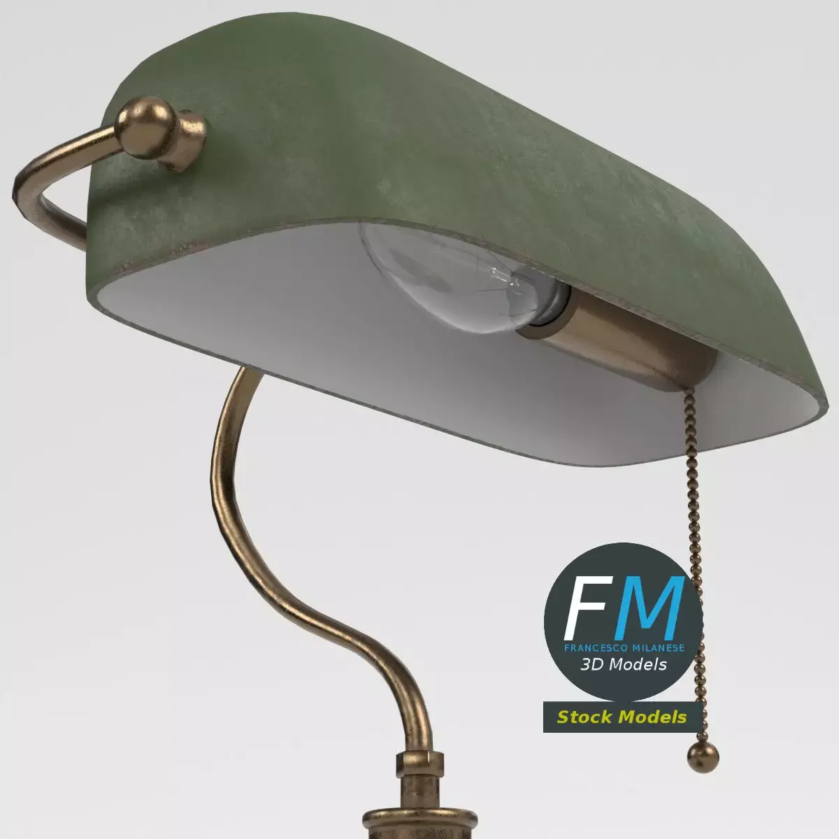 A classic banker's lamp 3D Model featuring a worn green glass shade, aged brass base, and curved metal arm with a dangling pull chain, ideal for vintage or office-themed scenes. 1 objects, 2 Materials (frame, glass; so, you can easily change the glass Material into an emitting one), single non overlapping UV Layout map, 2 PBR Textures sets. Production-ready 3D Model with non overlapping UV Layout map provided in the package. PBR Materials and Textures (Metallic Workflow: Base Color, Metallic, Roughness, Normal) embedded in the Blend, FBX, and GLB files.Easily customizable: UV unwrapped geometries; UV Layout maps provided in the package as png with alpha images.Quads-only geometry.Made with Blender 4.5 LTS with Cycles Principled BSDF (PBR, Metallic Workflow) Material, then exported to other formats (OBJ, FBX, GLB; FBX and GLB have embedded textures).Promo images: some renderings made with Cycles for Blender, plus Wireframes and Blender screenshots (Object Mode, Edit Mode with UVs).Formats included: FBX with embedded PBR Textures (Metallic Workflow: Base Color, Metallic, Roughness, Normal), GLB with embedded PBR Textures (Metallic Workflow: Base Color, Metallic, Roughness, Normal), OBJ; scenes: BLEND (with Cycles Principled (PBR) Materials); other: 16-bit PNGs with Alpha.1 Object (mesh), 2 PBR Materials, UV unwrapped (non overlapping UV Layout map provided in the package).UV Layout maps and Image Textures resolutions: 2048x2048.Polygonal, QUADS-ONLY, 13312 vertices, 12887 quad faces (25774 tris).Real world dimensions; scene scale units: METERS in Blender 4.5 LTS (that is: Metric with 1.00 scale).Uniform scale object (scale applied in Blender 4.5 LTS).PBR Textues included: in a zipped folder, you'll find the PBR Textures set (as 16-bit PNGs with Alpha).IMPORTANT --- Main renderings made with Blender 4.5 LTS + Cycles using an HDR Environment Texture Image which is NOT provided in the package!