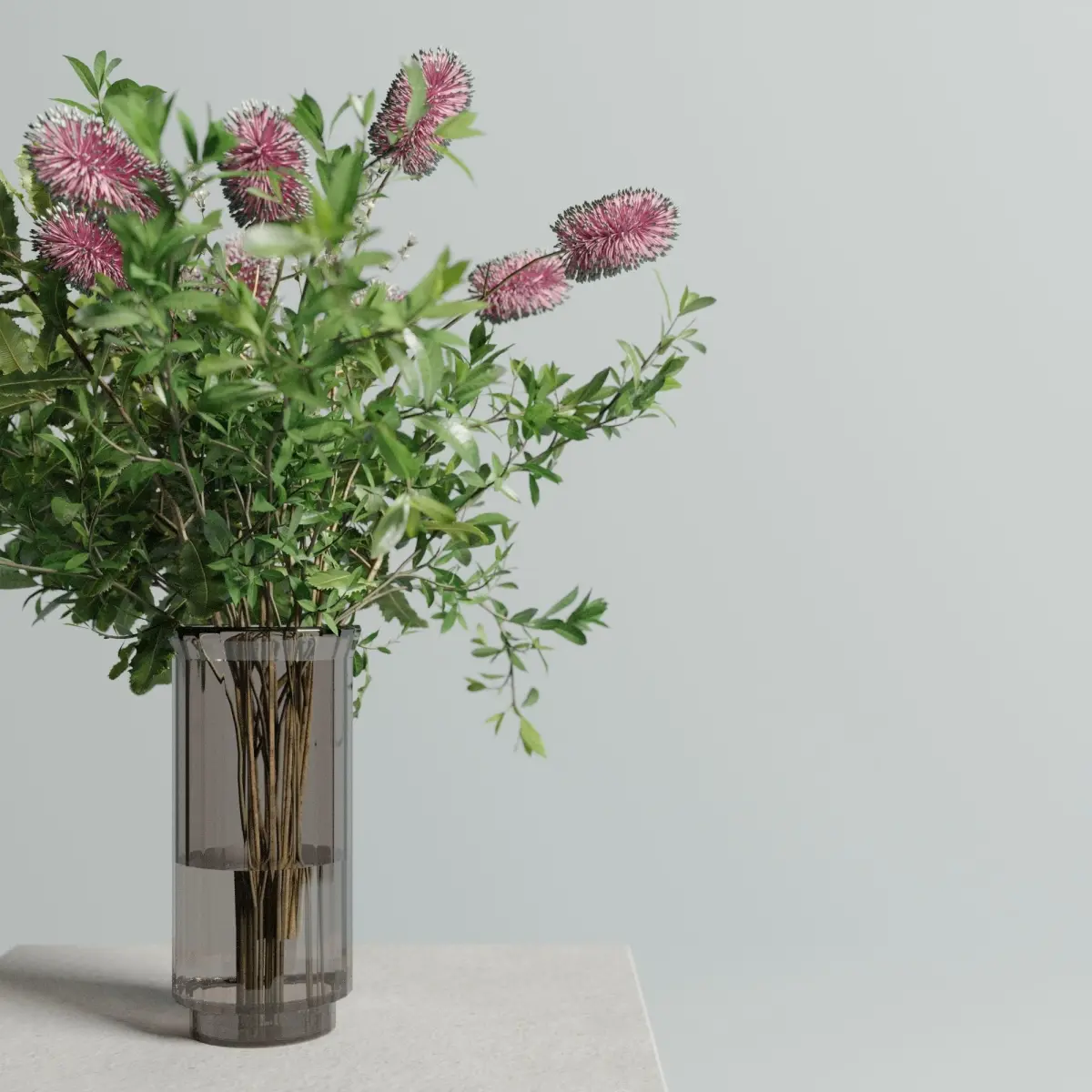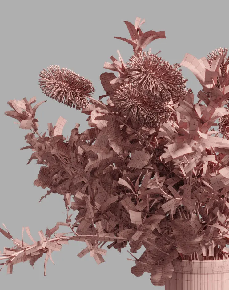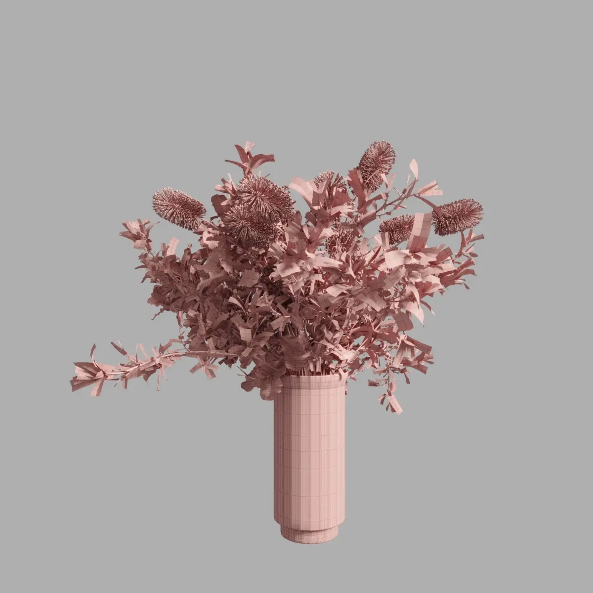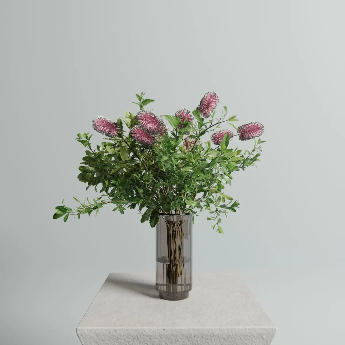 File includes glass vase, eucalyptus leaves, banksia flowers. Doesn't include pedestal.