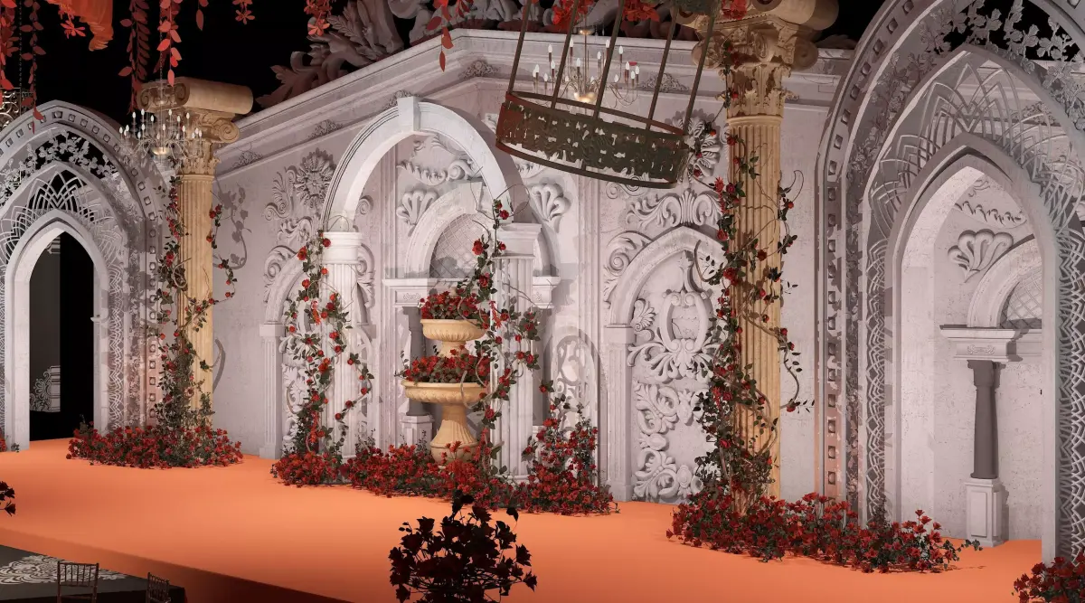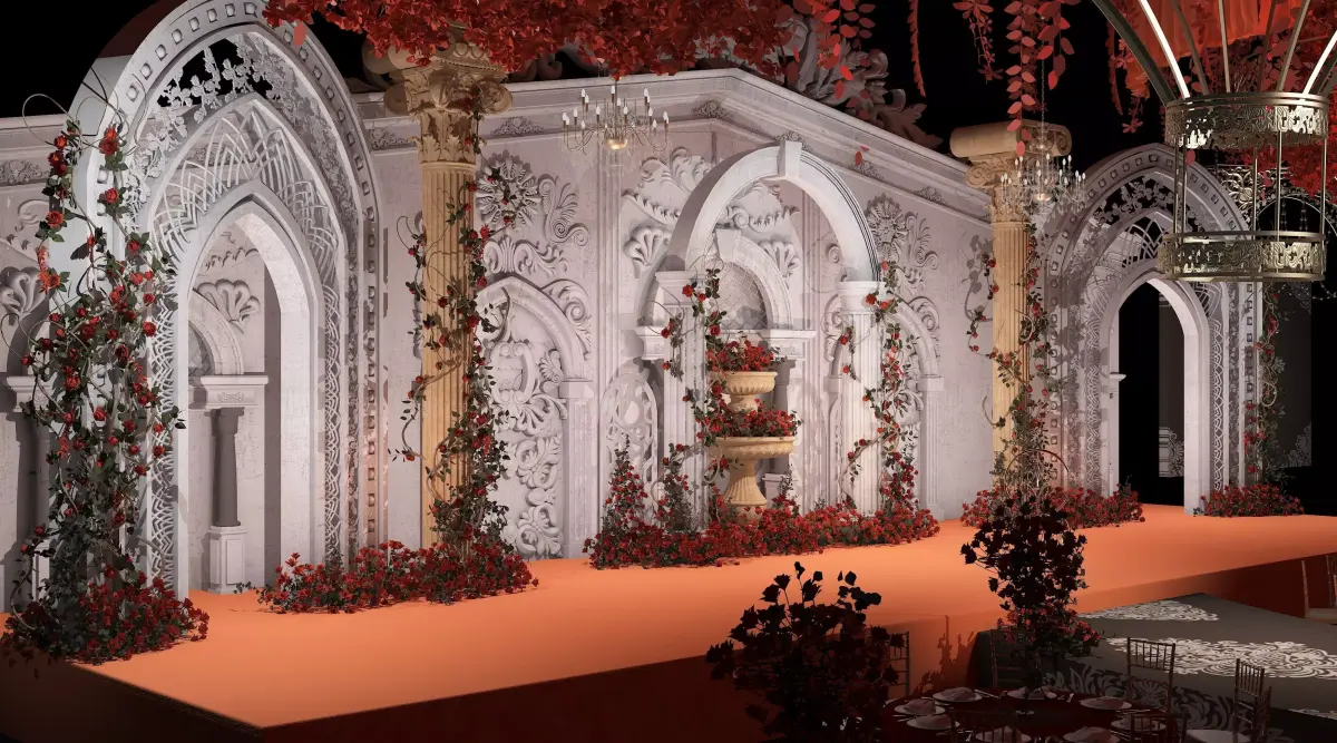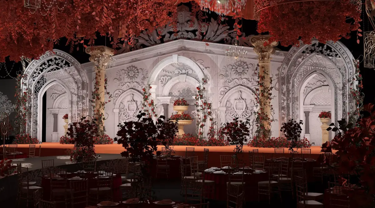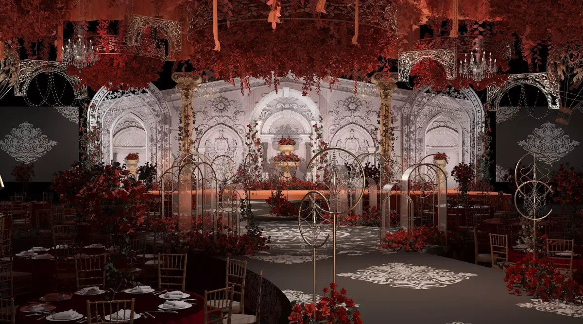 Banquet hall with dining sets and decorated with highly-detailed ark, columns and flowers. All naming in English.