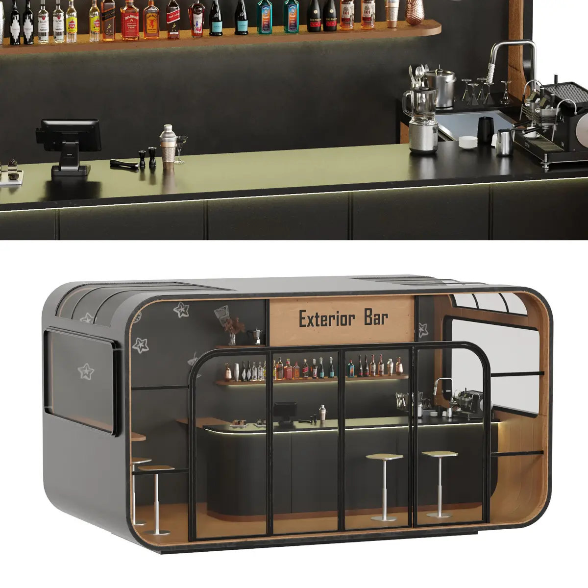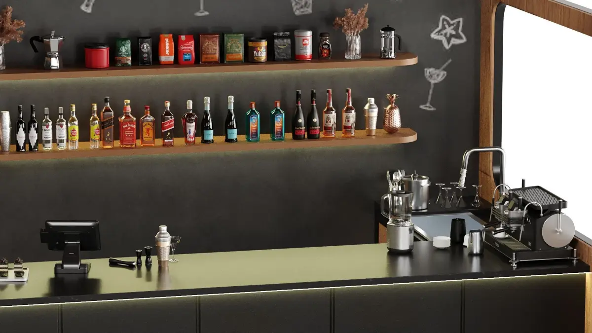 Bar 32 Exterior BarBottlesChampagne, Whiskey, vodka and WinesBar Appliances and AccessoriesCoffee MakerPlantsMax Version Is 2018Coronafbx,obj