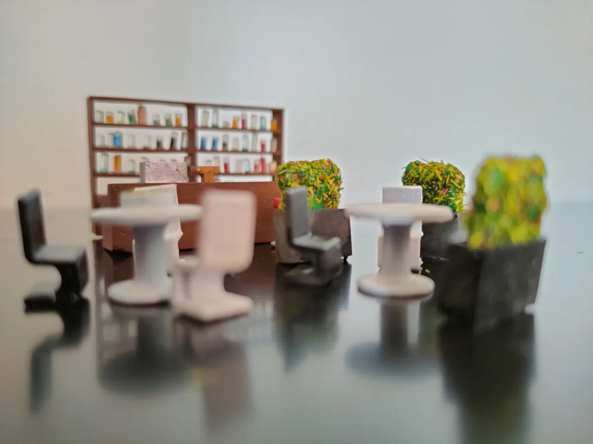 Disclaimer: The colored bottles in the rack are not part of the model. Use transparent pipes or old supports from transparent resin prints, cut in pieces and glue in the rack. Paint the transparent bottles from behind to create the effect of colorful liquids.