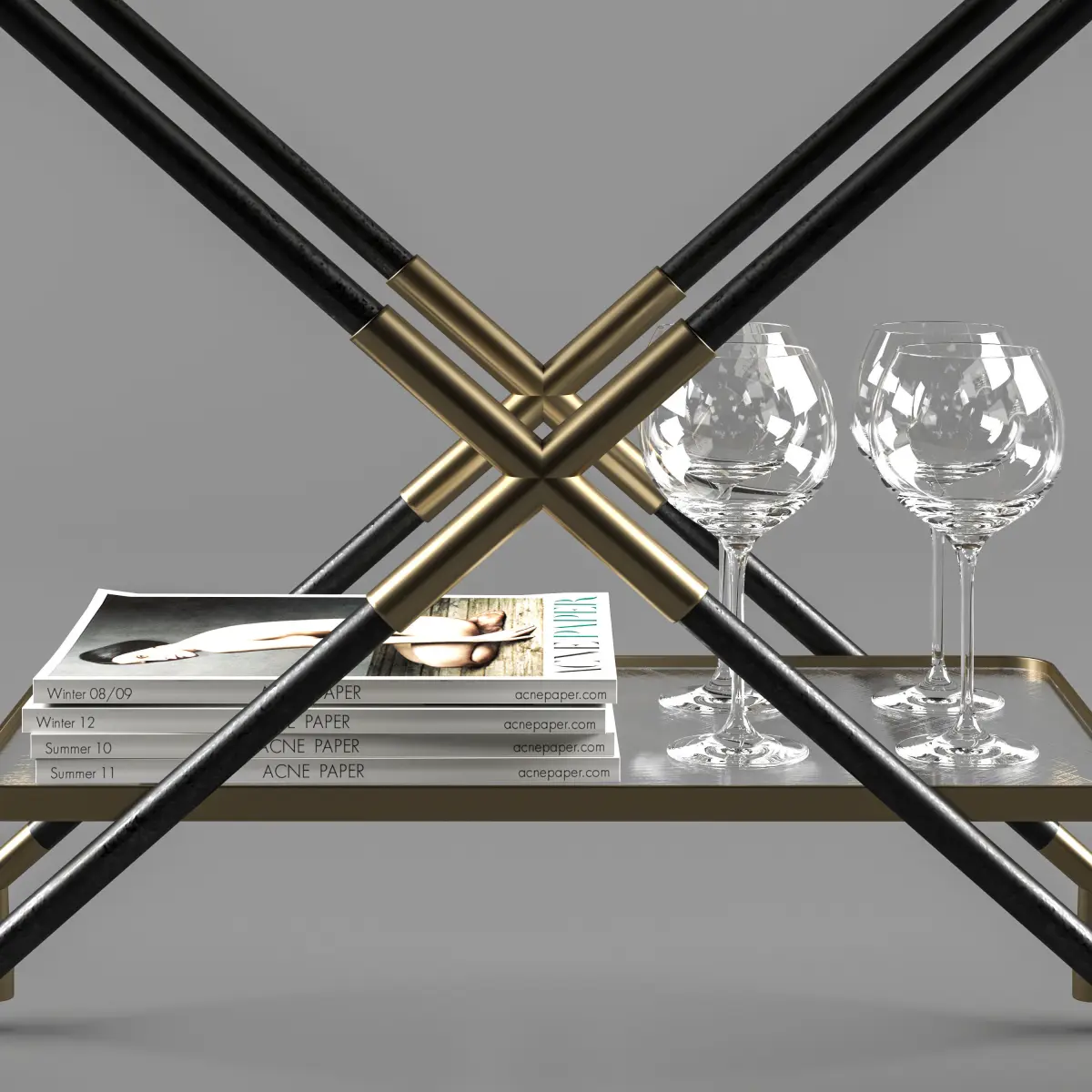 Bar Cart with Accessories. Accessories: 2 Red Wine and a White Wine, Wine Glass full of white wine, Jo Malone Candles, Vase with plant, Acne Paper Magazines and 4 Wine Glasses.