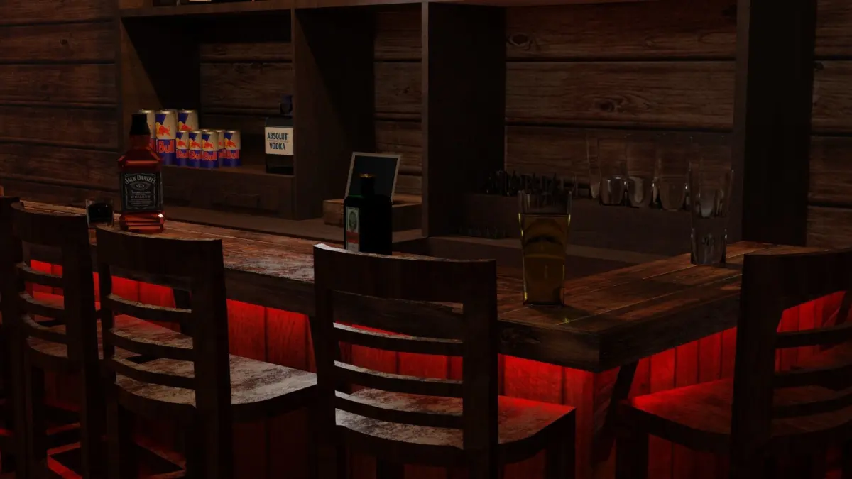 Also, to some items (chairs, bar counter and chains with fasteners) the roughness material is connected and the bump node is added