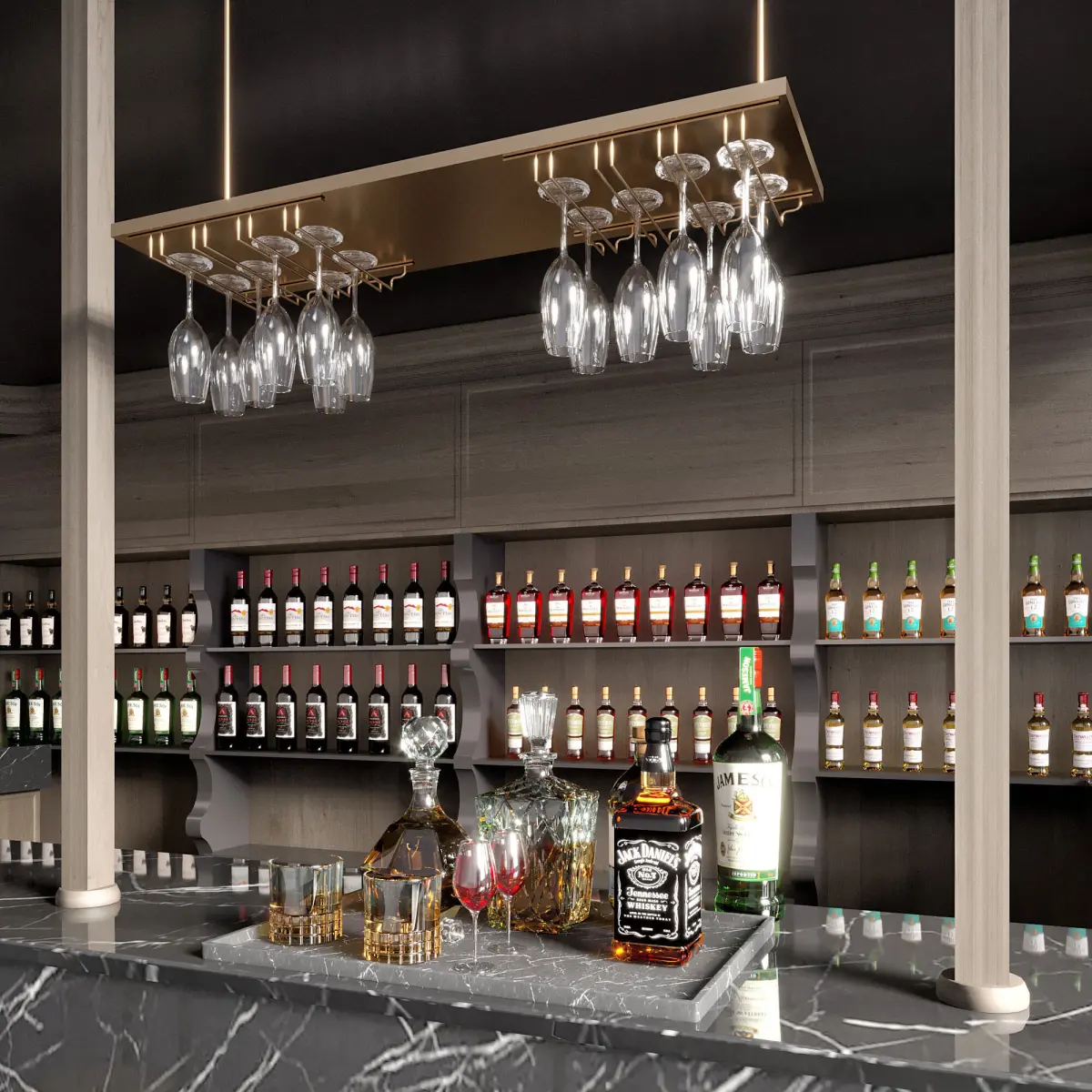 it includes different high poly and detailed objects like chairs,whiskey bottles,wine bottles,champagne,bucket,decanter and....